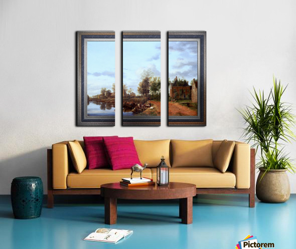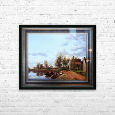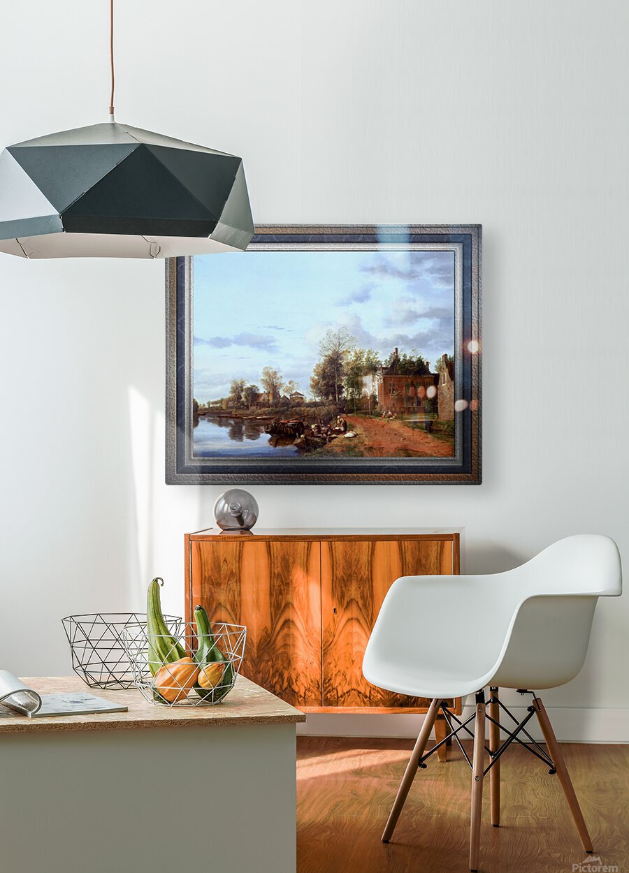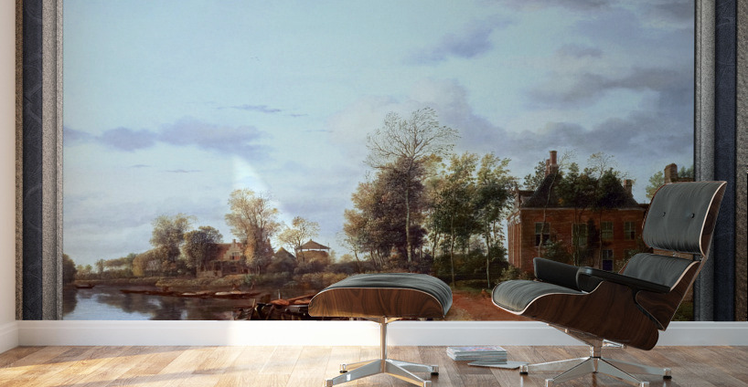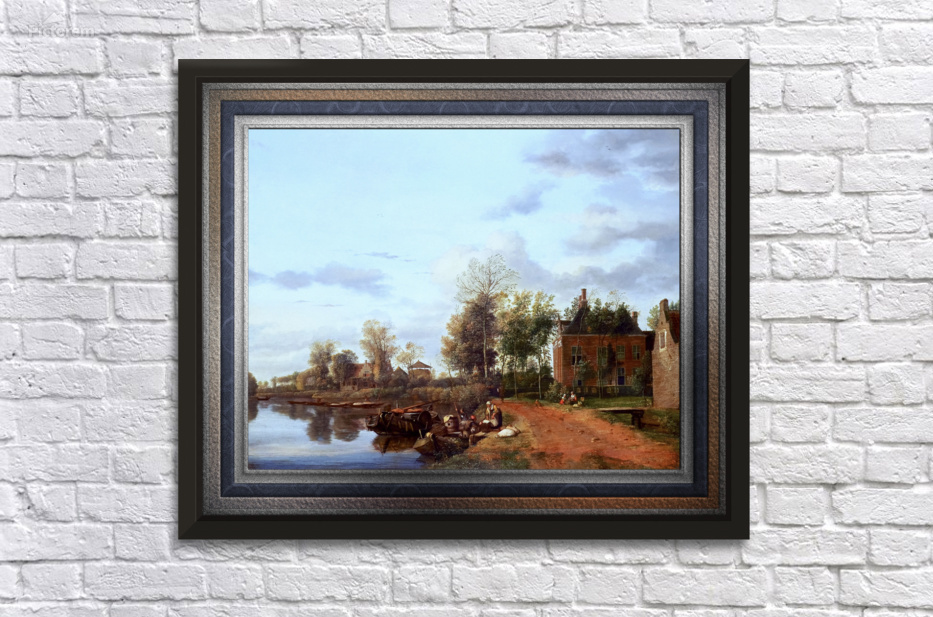 A Country House on the Vliet near Delft c1660 by Dutch Painter Jan van der Heyden (1637 - 1712); a Baroque era painter, draughtsman, printmaker and glass painter that specialized in townscapes, during the Dutch Golden Age. This is a fashionable depiction of a part of Holland in the 17th century with a navigable canal or river passage with a well kept traveling path; and as can be seen a considerable amount of freight traffic along the waterway. On the right bank of the canal are houses and plots of land that extend into the low lying reclaimed fertile lands, with elegant farmhouses that are similar to the one most closest to the viewer; with its ionic pilasters and dormer windows with scrolls. On the bank by a small pier there is a large boat with people as a woman receives goods from the merchant of the boat; and farther down the path we see man walking, a dog and off the path to the right a lady and young girl are sitting on the grass near the main house working. Lining the bank of the river are plenty of short trees, grass and plants; while many larger trees surround the houses in the area. This is a retouched digital art old masters reproduction of a public domain image.