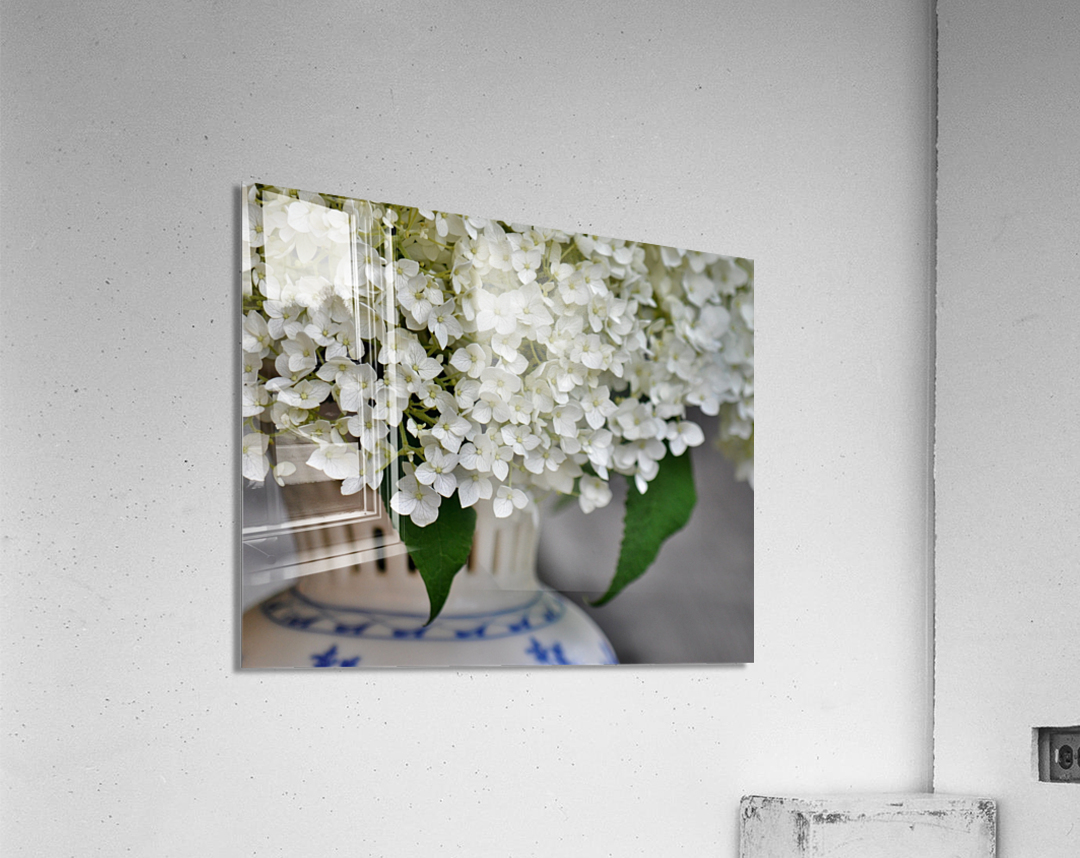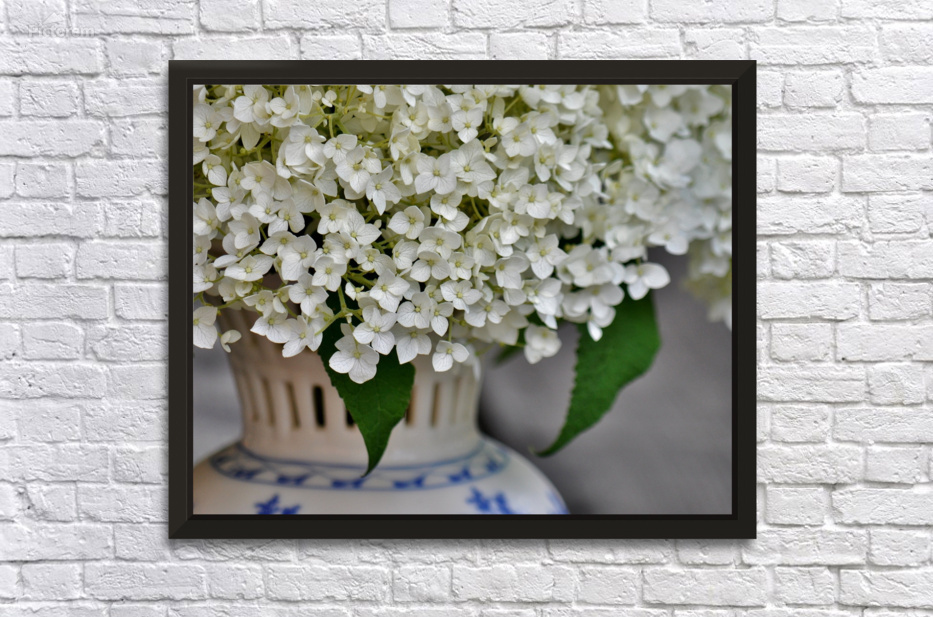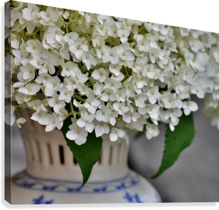 A charming depiction, white Annabelle Hydrangeas photographed in a vintage vase utilizing selective focus technique and natural light.