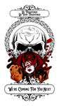 A Haunting Place is a digital creation for Halloween that depicts a blood thirsty ladies face with bloody red eyes, bloody red lips and bloody red bandages across her face revealing her right eye. She has The Bride of Frankenstein's creature red and black hair and a classic Bela Lugosi Vampires collar around her head; with a thirst for blood look. On the right side of her face is a howling ghoul and on the left side of her face is a hissing black cat. Behind her is a giant white skull with creepy skeleton fingers reaching out from it as well as a dark res to black bloody splash behind it and a large ornamental ring. At the top within a decorative ornament are the words Be Frightened, Be Very Frightened; and at the bottom is a duplicate decorative ornament with the words, We're Coming For You Next.