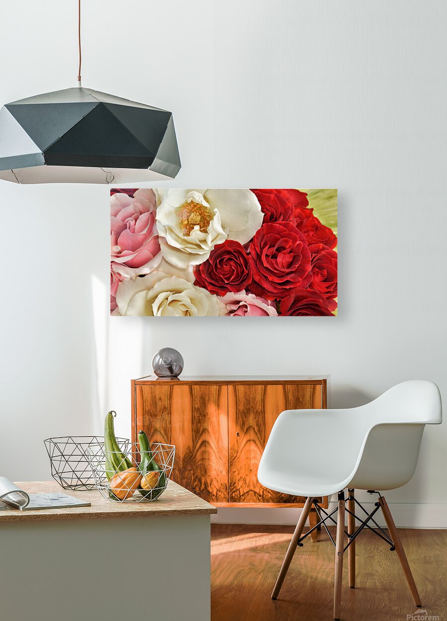 Gorgeously beautiful multi colored Roses arranged and photographed closely. This beautiful romantic image unveils the Queen of the flowers in a variety of colors and stages of blooming.