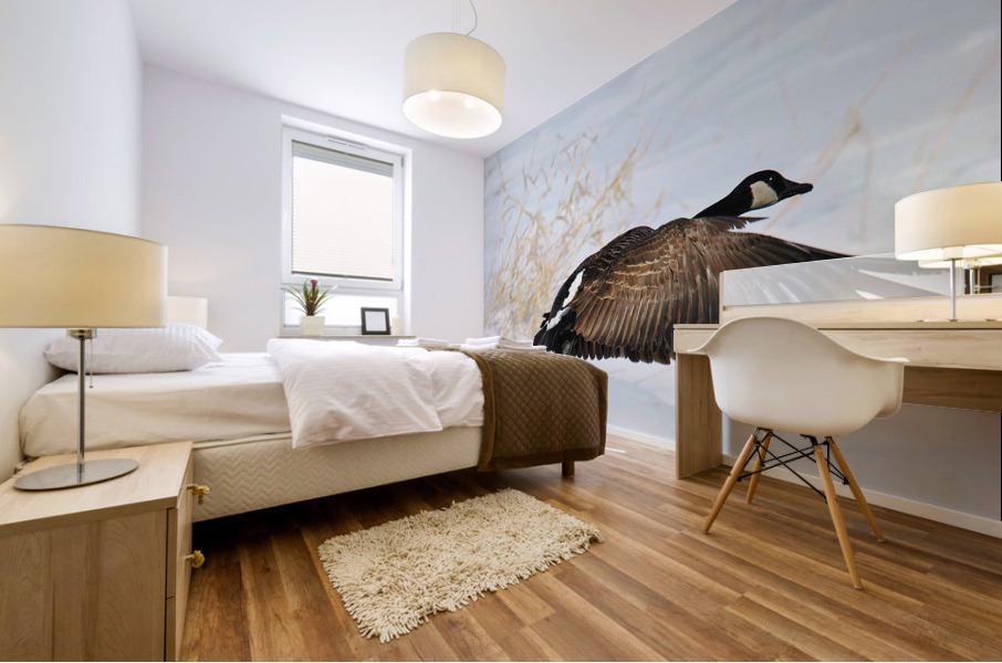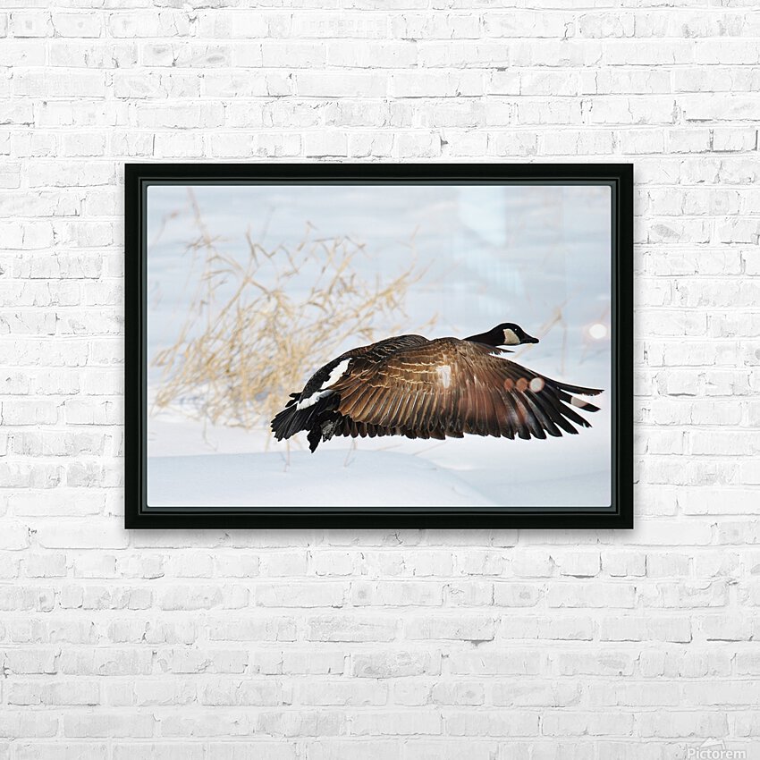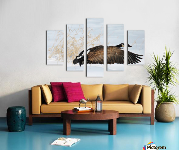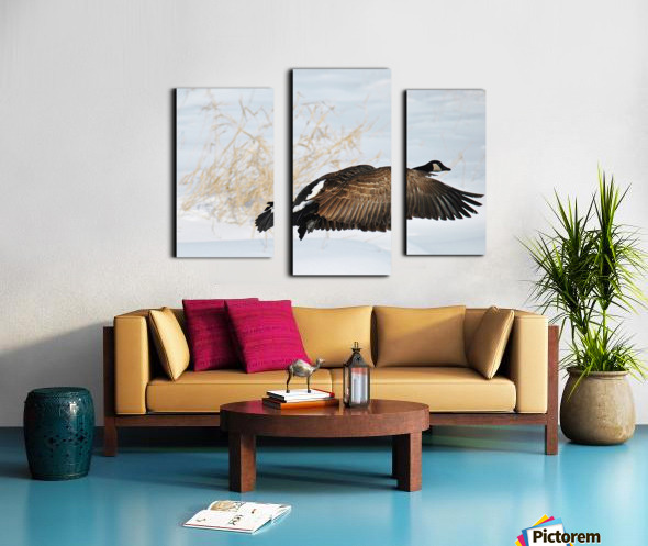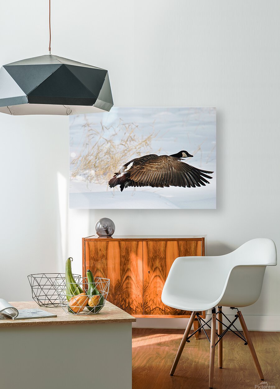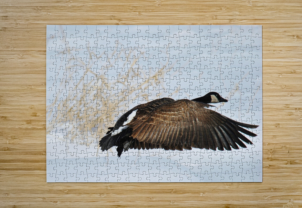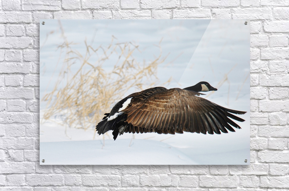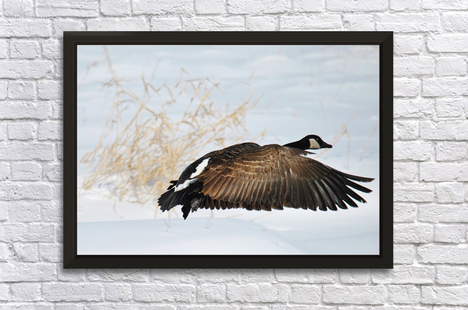 A beautiful Canadian image featuring a Canada Goose in flight on a winter afternoon. Selectively focused and photographed closely in natural light, this image displays the powerful wingspan of this large celebrated bird.