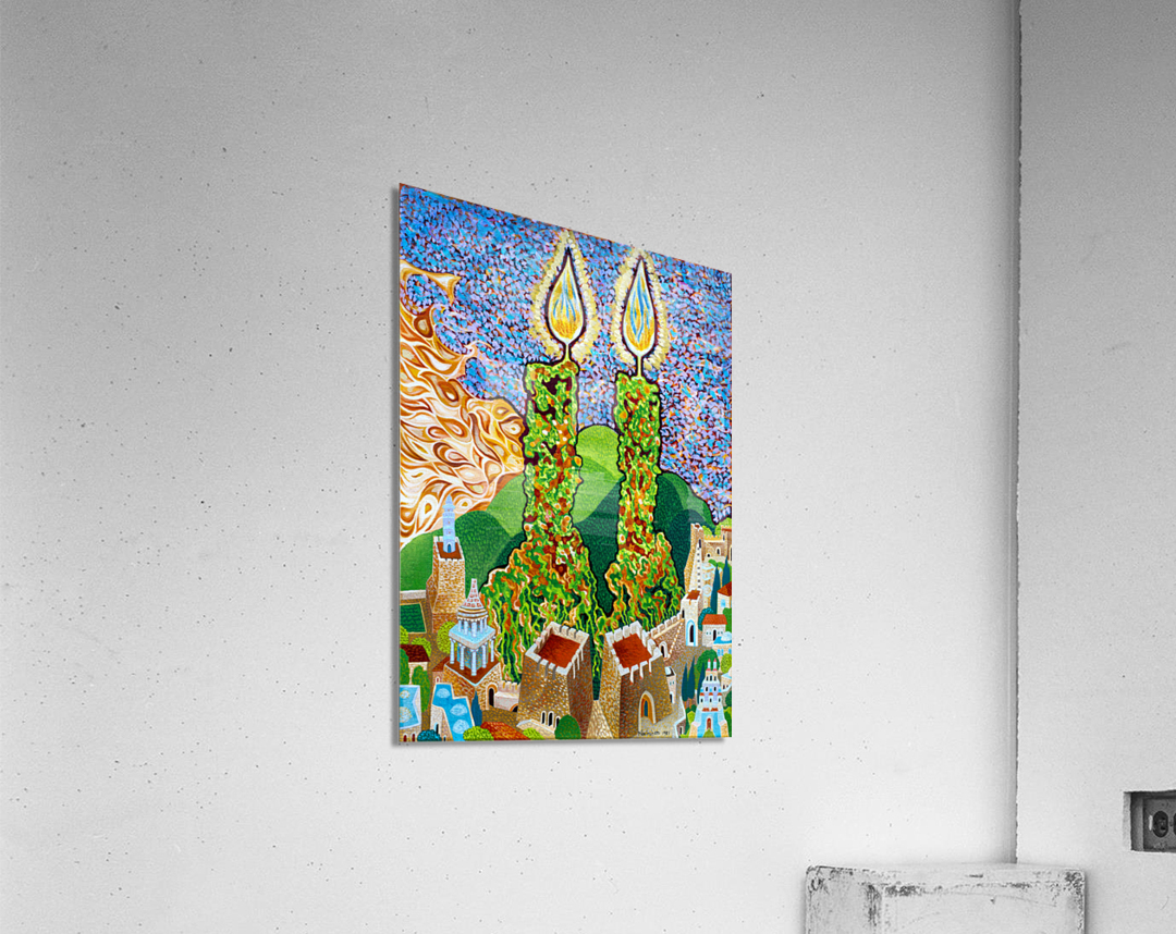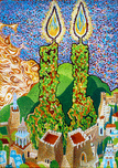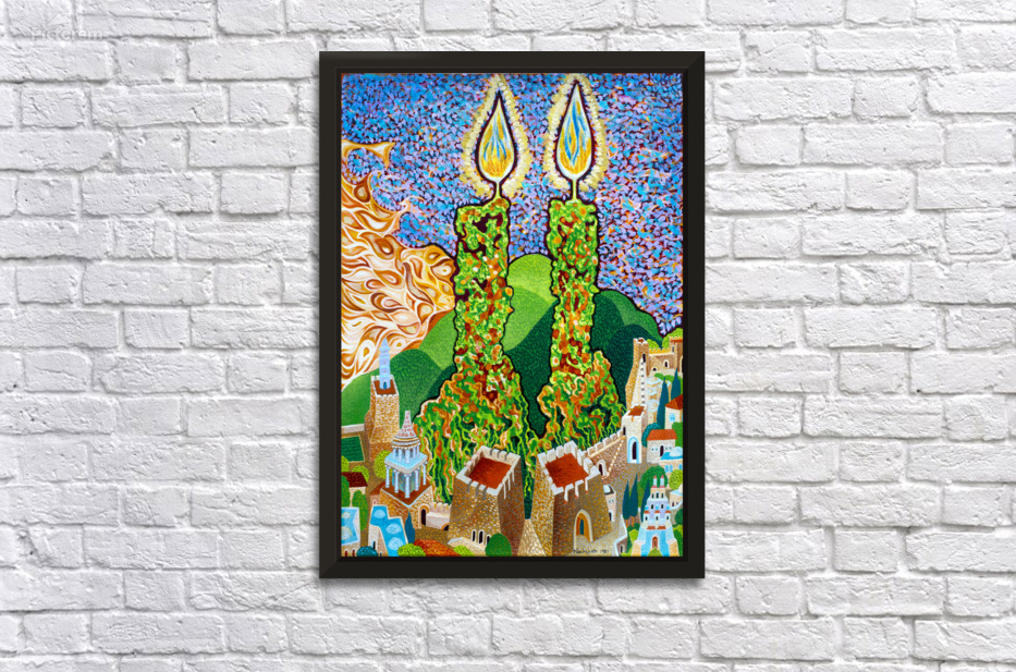 My use of symbolism has developed over time. I slowly came to appreciate that I was making repeated use of symbolic elements as a poet plays with new turns of phrase. One can find in my work frequent groupings of seven or eighteen (numerologically representative of life (or chai) in Hebrew) and twenty-six (corresponding to an important Divine Name). Drops of dew are conspicuous, as are tongues of flame, the Holy Temple, the City of Jerusalem, winged candles, tefillin and tzitzit. Also angels’ wings, ladders, musical instruments and – broadly speaking- connections between heaven and earth. Baruch Nachshon