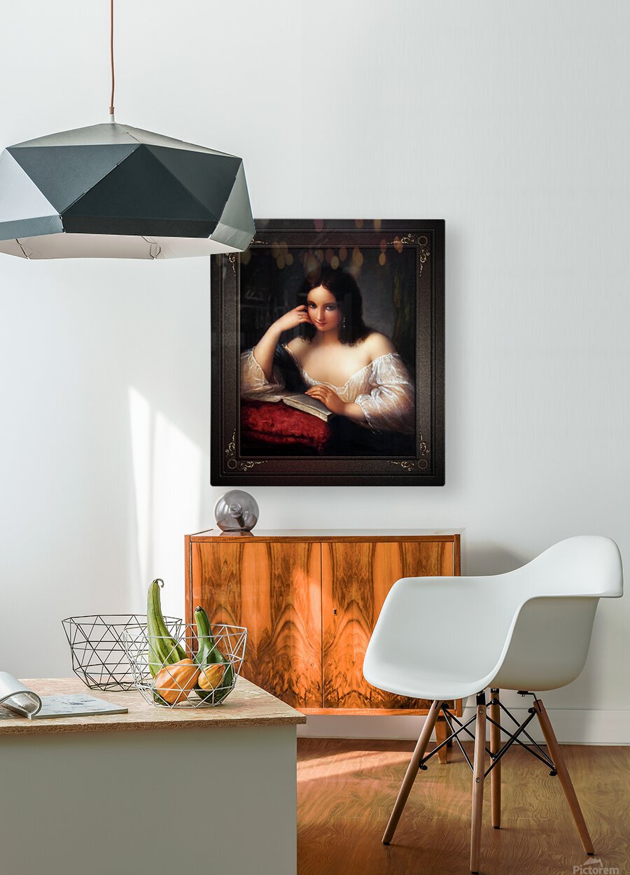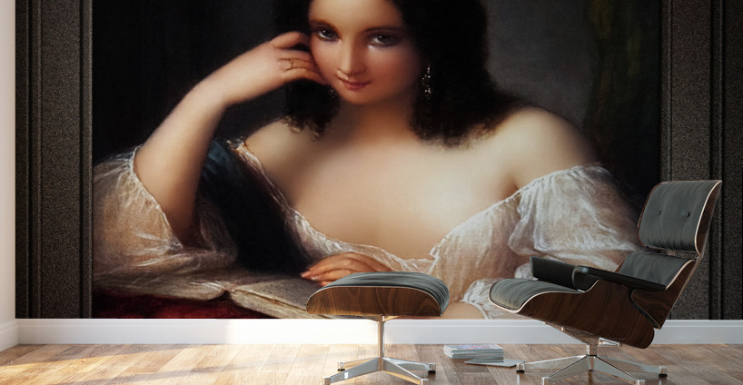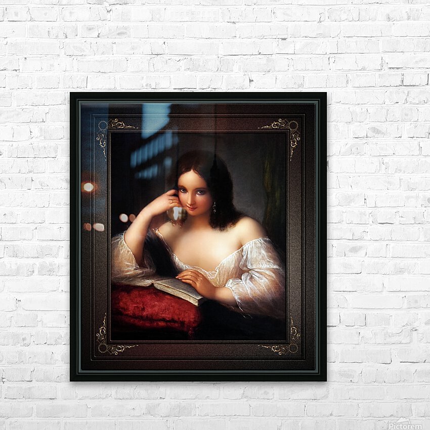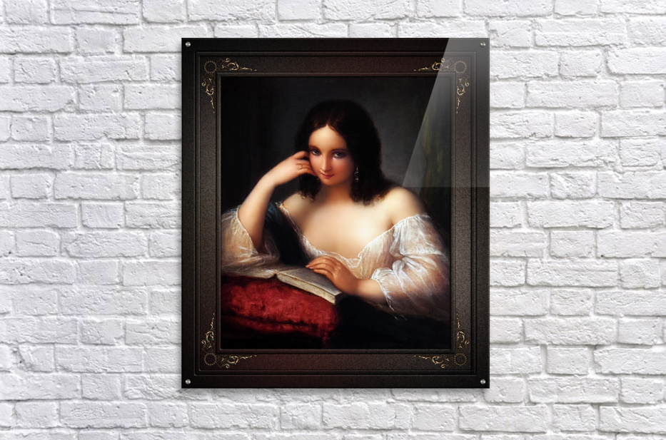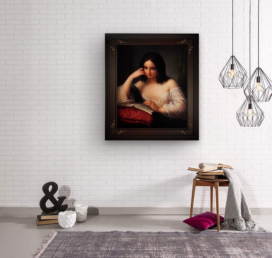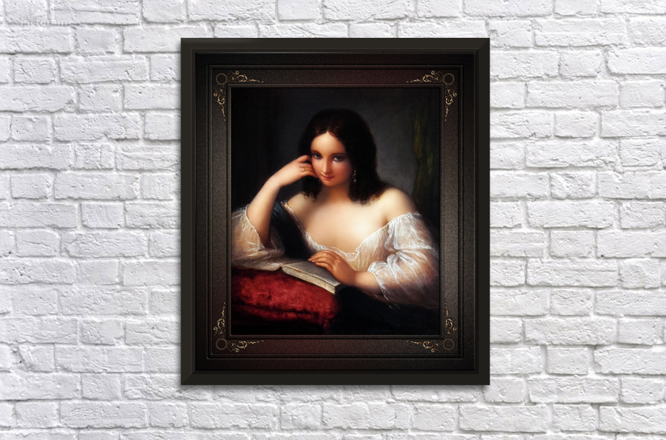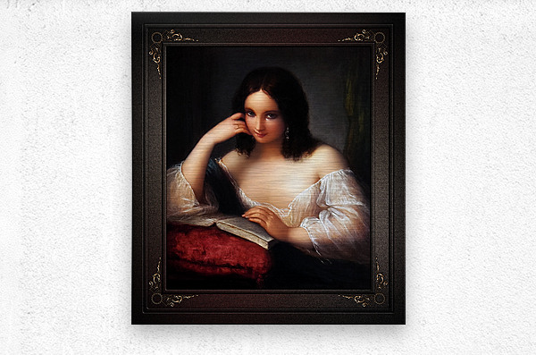 Italian Beauty Reading by Italian Painter Natale Schiavoni (1777 - 1858); and engraver known mainly for depicting historical events and portraits; with many of his paintings depicting seductive nubile women. This is a stunning portrait of a young Italian brunette beauty sitting by a table reading a book the his placed on a large red pillow with tassel. The young lady is wearing silver earrings and a gold ring on the fourth finger of her right hand, a sheer white silk blouse and a blue cape rest over her folded right arm that her head is leaning against that is supported with her elbow resting on the right part of the open book. The background is a plain gray stone wall with a deep shadow on her right and on her left is a green drape that is hanging from the wall in the corner. This is a retouched digital art old masters reproduction of a public domain image.