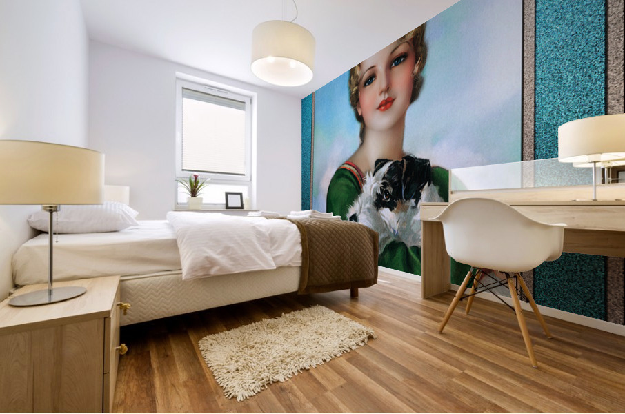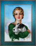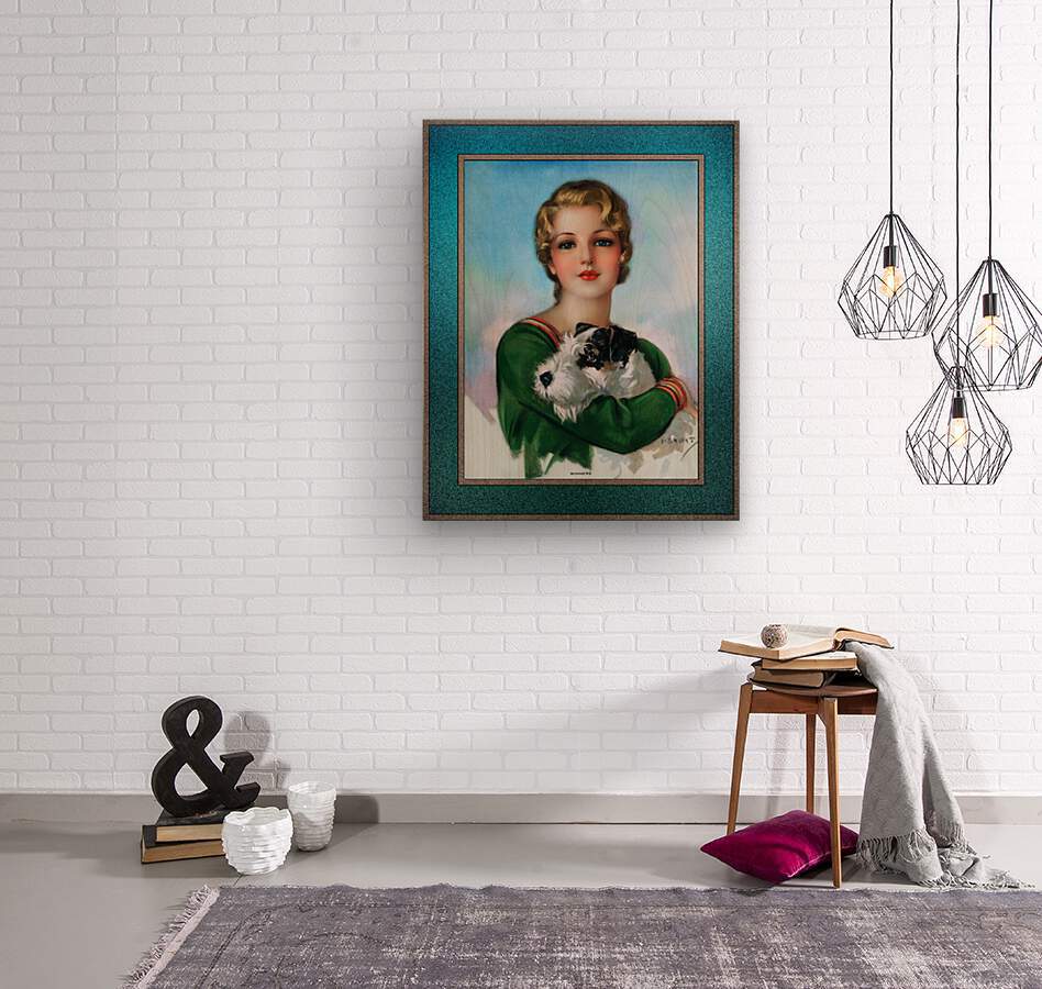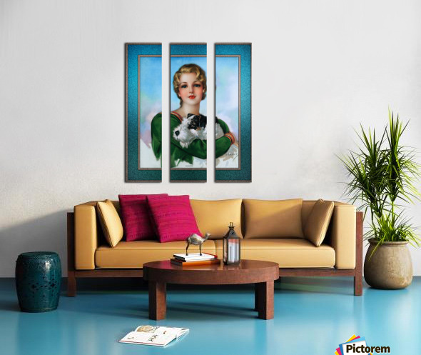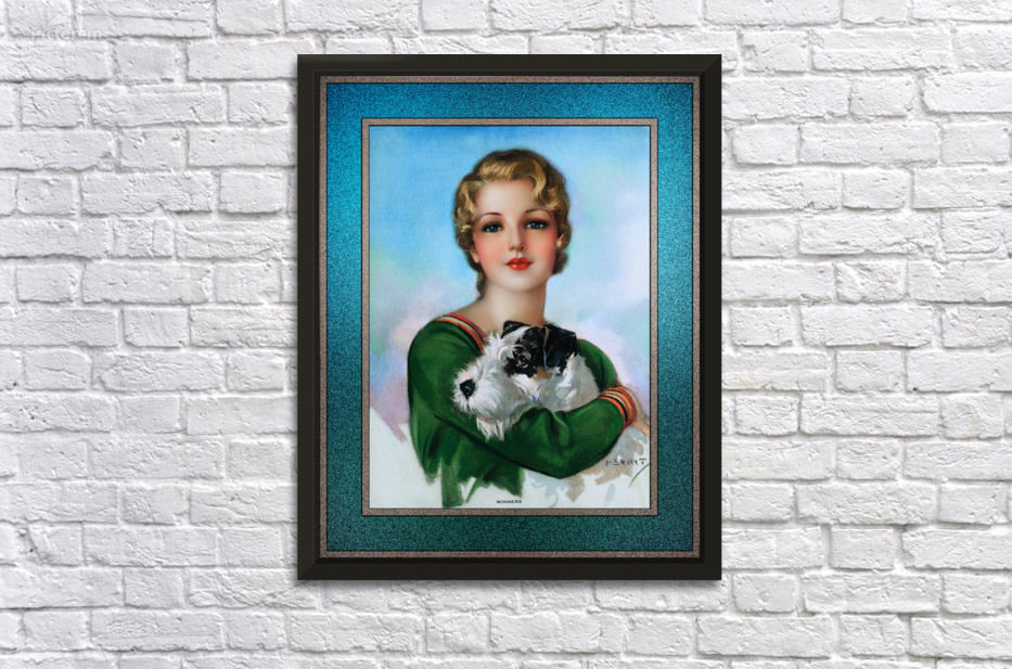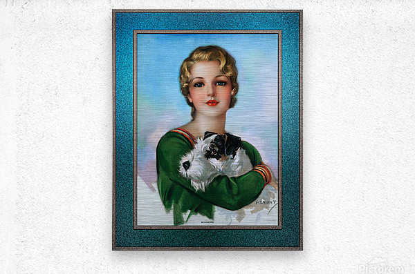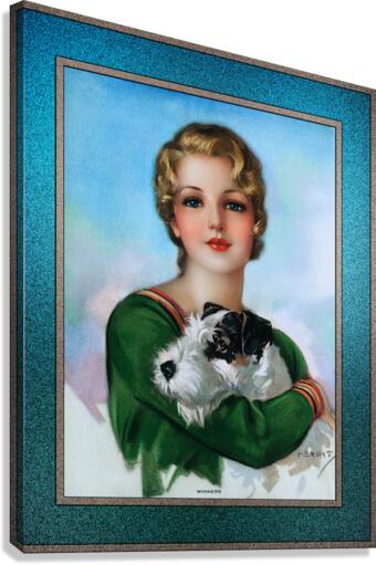Winners, A Girl And Her Dog by Hungarian Painter Jules Erbit (1889 - 1968); a pastel painter known for his female portraits and calendar illustrations. This is a charming and elegant pin up girl genre portrait of a beautiful young lady with blonde hair and wearing green blouse with yellow and orange stripe trim along the collar and sleeves; holding her pet dog. On the bottom of the artwork is the word WINNERS, which may indicate that she and her dog were involved or were part of some sort of competition. This is a retouched digital art old masters reproduction of a public domain image.
