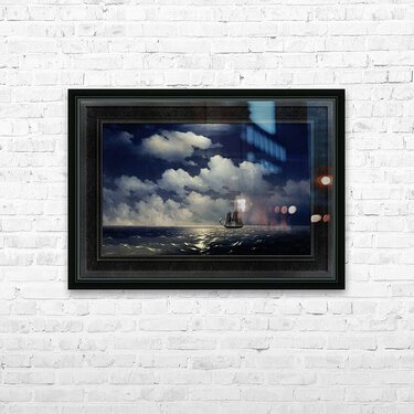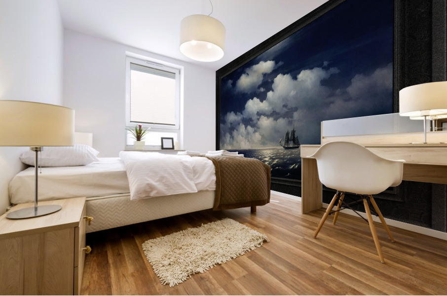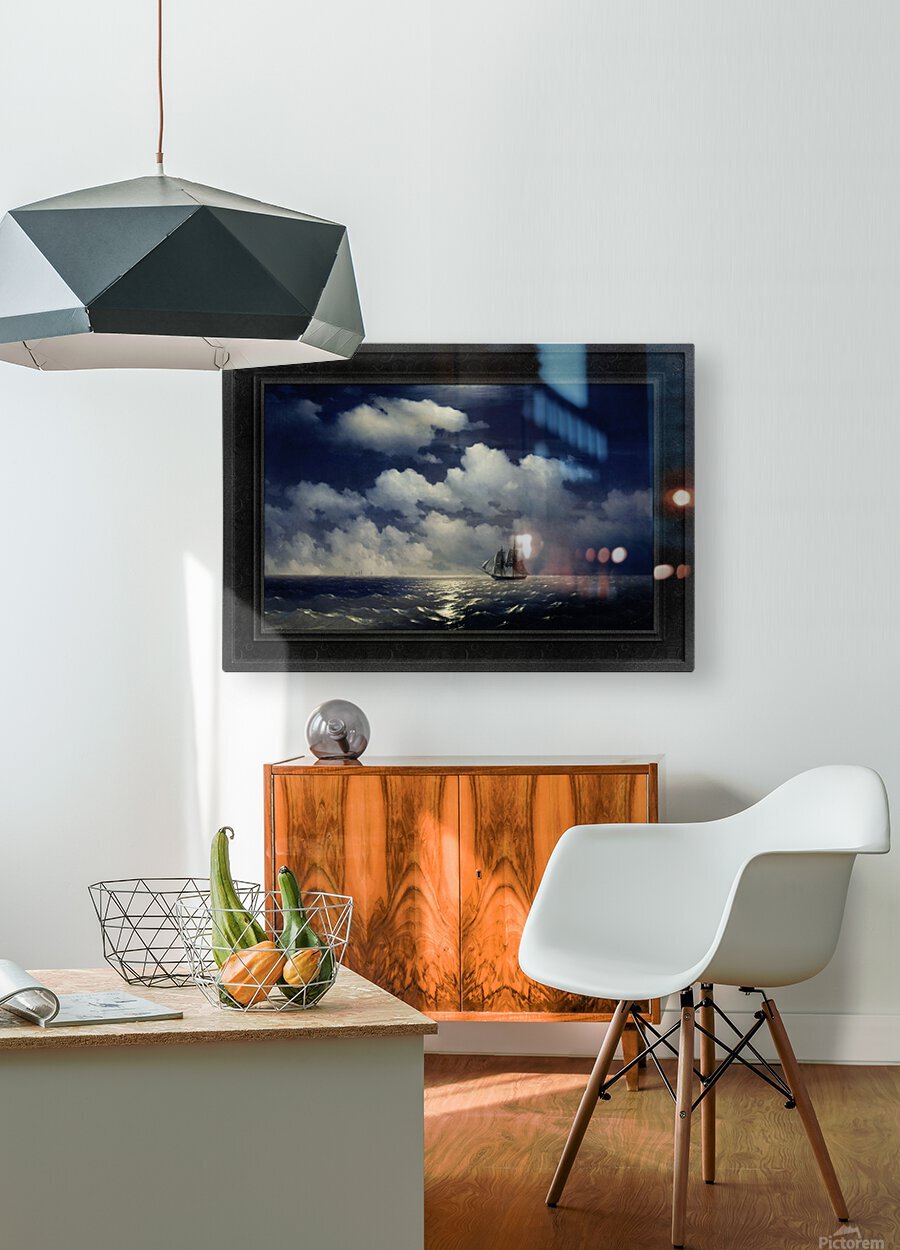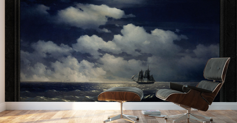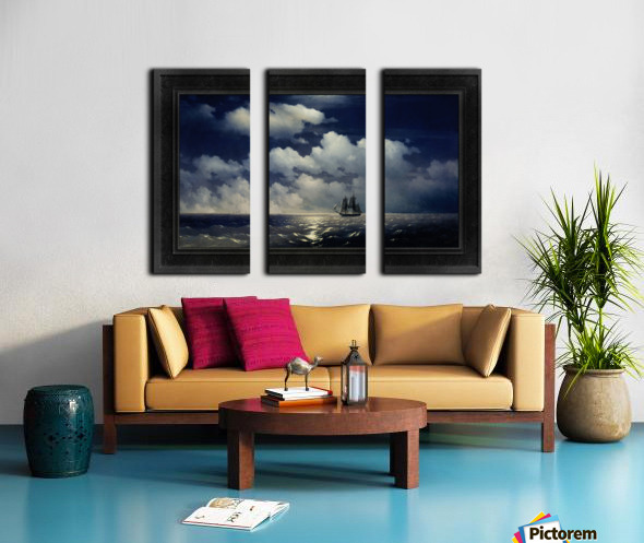 The Brig Mercury, after defeating two Turkish ships, meets with the Russian Squadron c1848 by Russian Painter Ivan Aivazovsky (1817 - 1900); a Romantic painter considered to be one of the greatest masters of marine art. The Brig Mercury was an Imperial Russian Navy 18-Gun two-masted warship; that is famous for its battle with two Turkish ships on May 14, 1829. The Mercury was pursued by a Turkish fleet of 6 ships of the line, 2 frigates and 2 corvettes; and in engaged with the ships-of-the-line the 110-gun Selimiye and the 74-gun Real-bei near the Strait of Bosphorus, also known as the Strait of Istanbul. After inflicting damage on each of these ships the Mercury was able to escape its pursuers and meet up with the Russian Squadron. This painting shows the Brig Mercury on a calm wide open seas with her tattered sails on her way to meet up wit the Russian Squadron, that can be seen in the far distance under a full moon lit white cloud filled sky. This is a retouched digital art old masters reproduction of a public domain image.