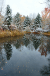 Picture-perfect setting, a dusting of new snow on a curve of pine trees, all reflected in a pond. Boise, Idaho