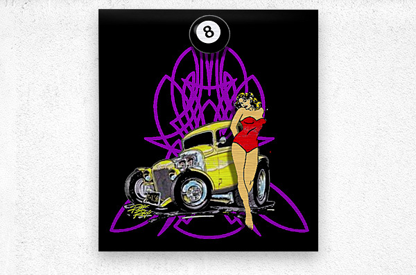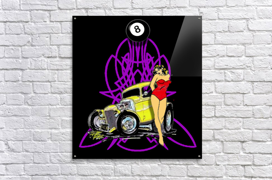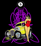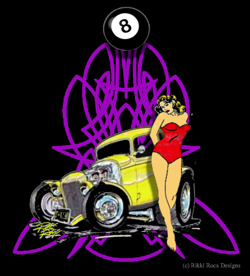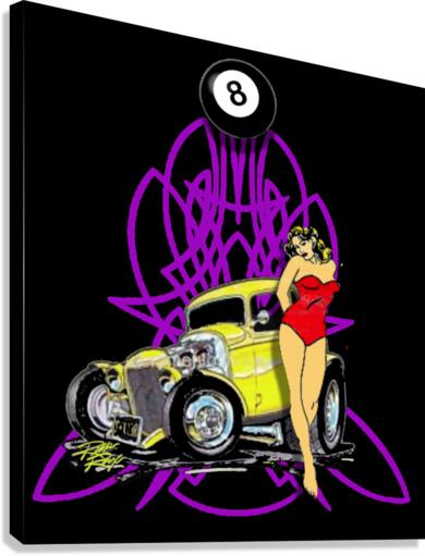 American Classic 1932, 3 window yellow coupe, pin-up girl, and nice pin-stripe design