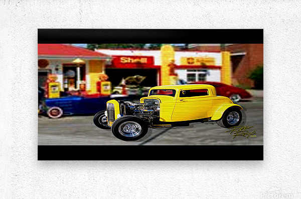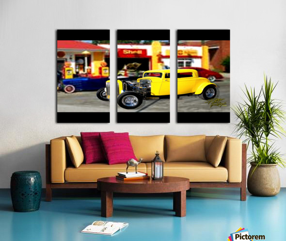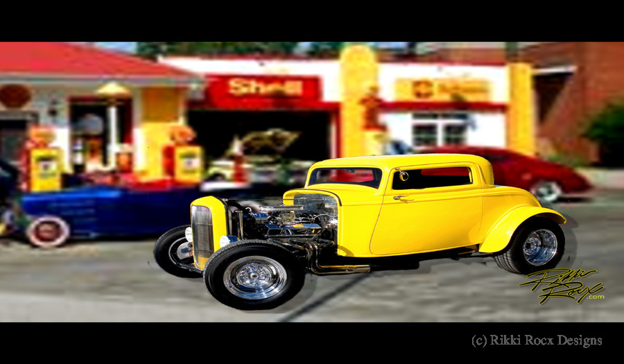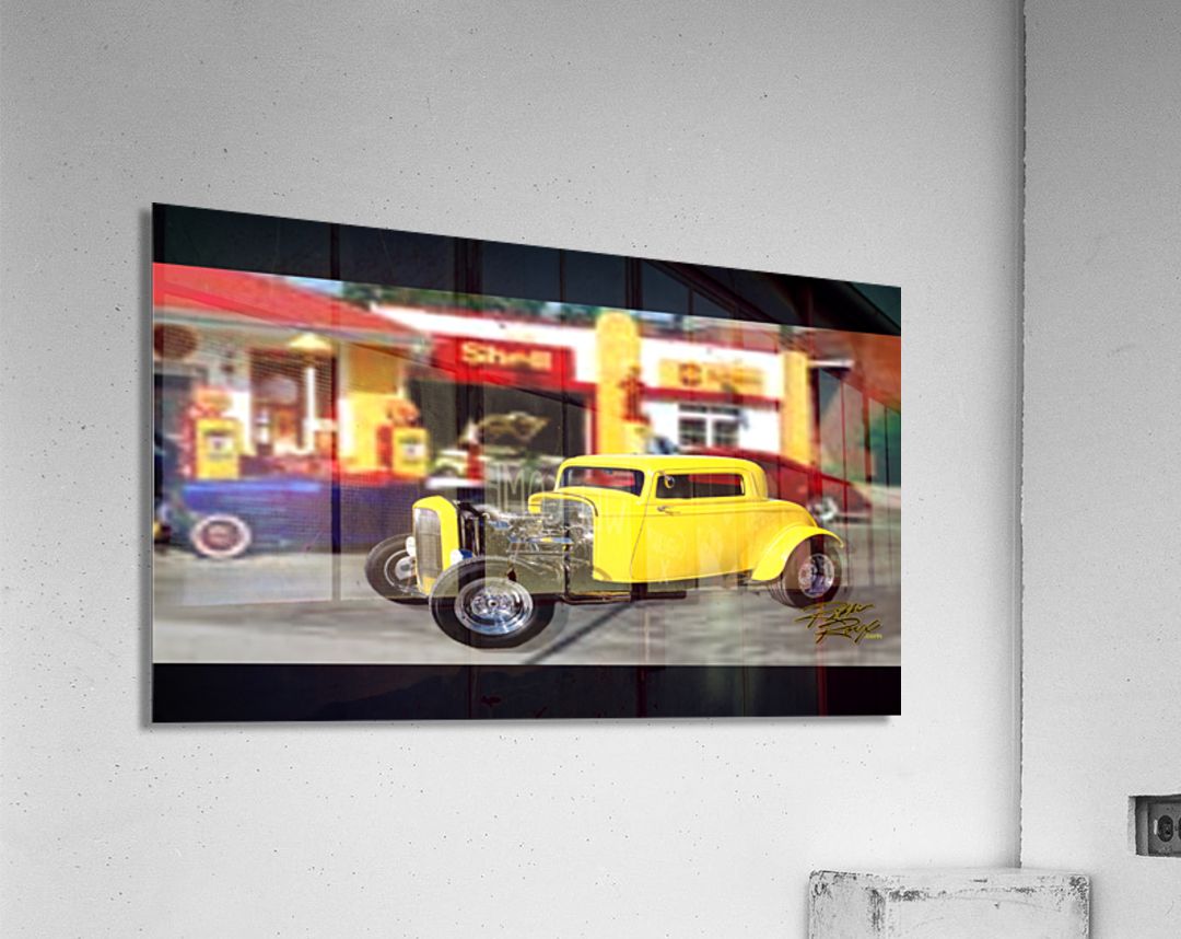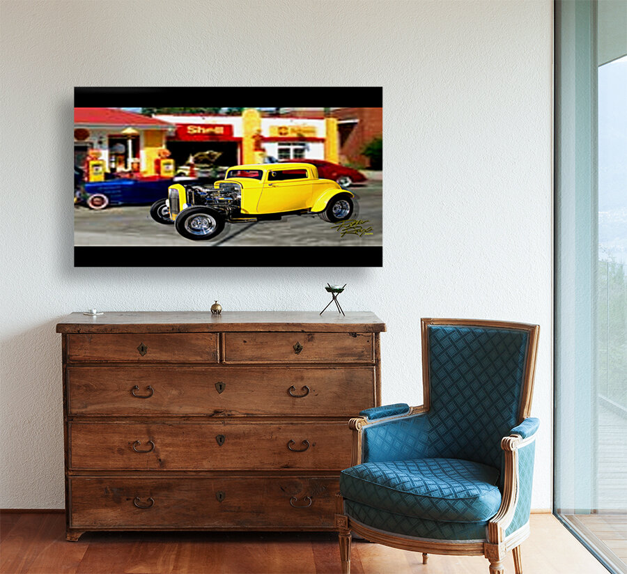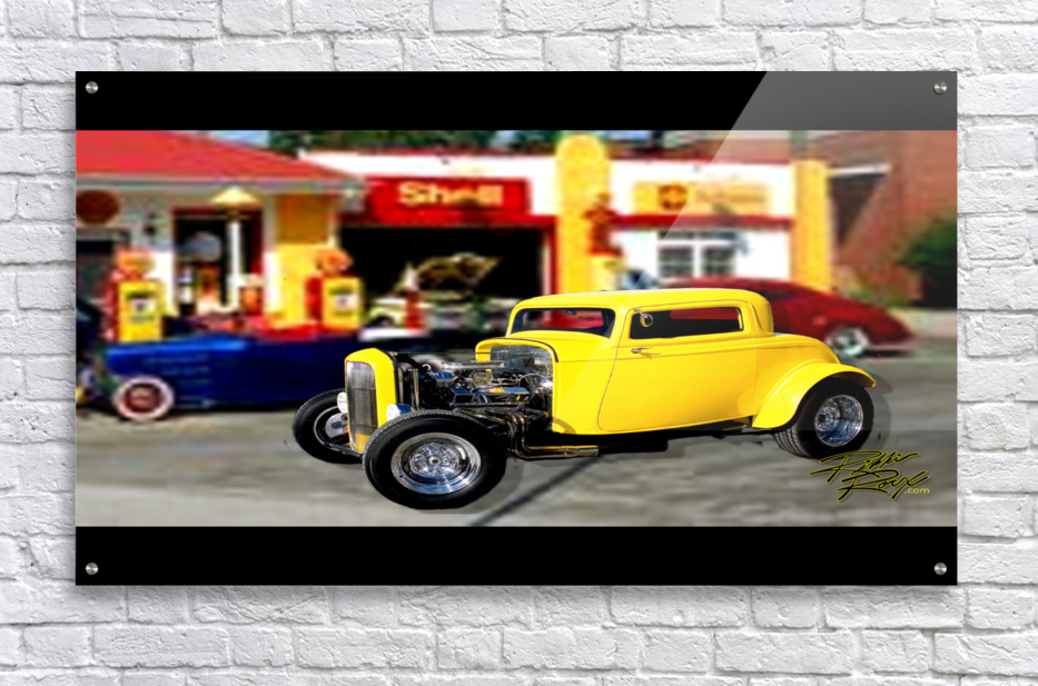 All of the car Rikki Rocx Has in his art is done by the paintmaster Russ Gerner for his clients of the yrs. for full wall mural. example:wall size 13',2"wide X 9',8" Height. example: wall size Wide 11',2" X 8'2" Height . put your size in get price and look at box to left to make sure of fit, Move/adjust Art in box to get the best look fit. There is another same Hot Rod Gas Station for all other awesome prints.
