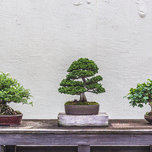 The ancient art of Bonsai trees on display on a wooden table in front of a white wall
