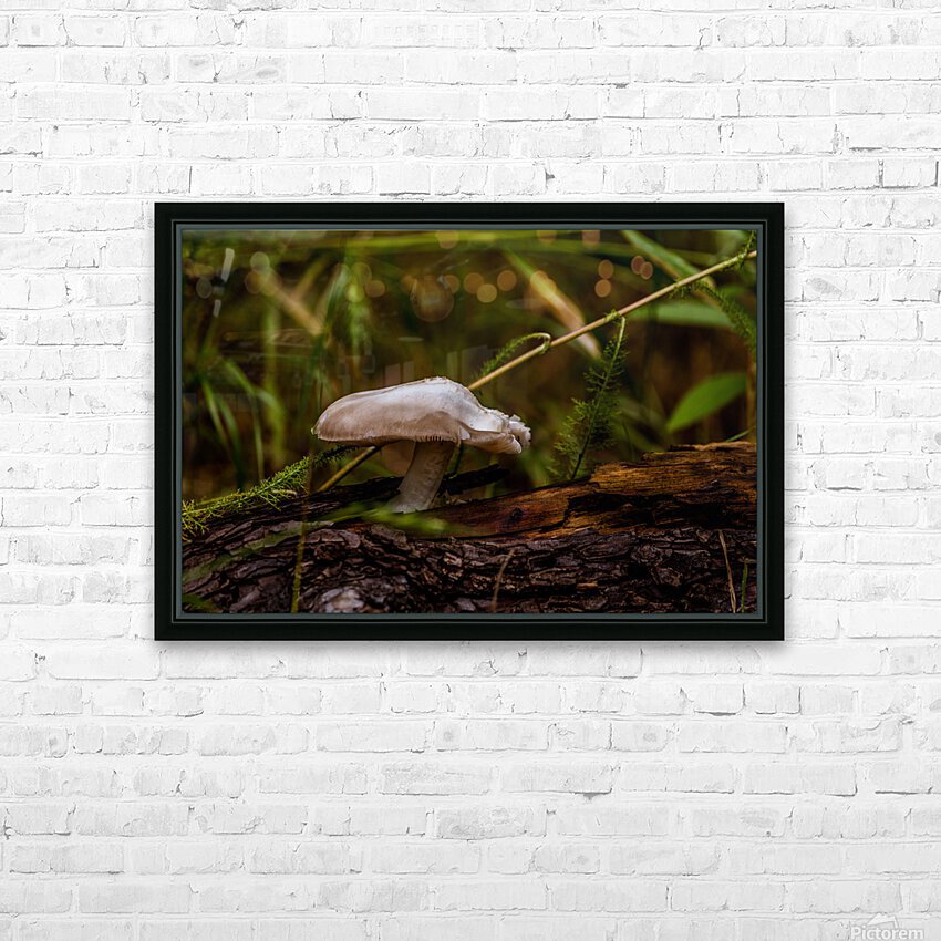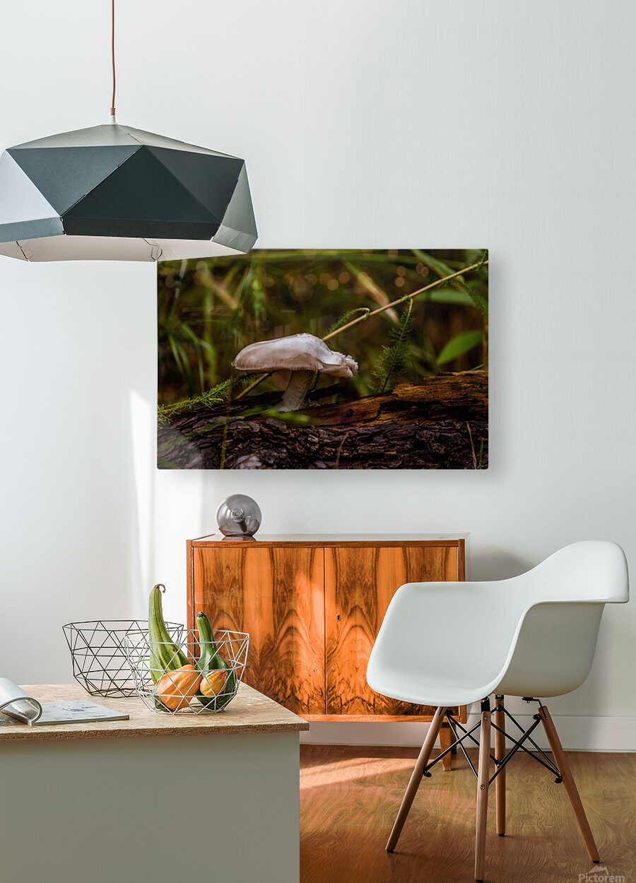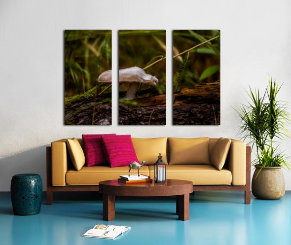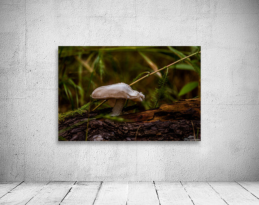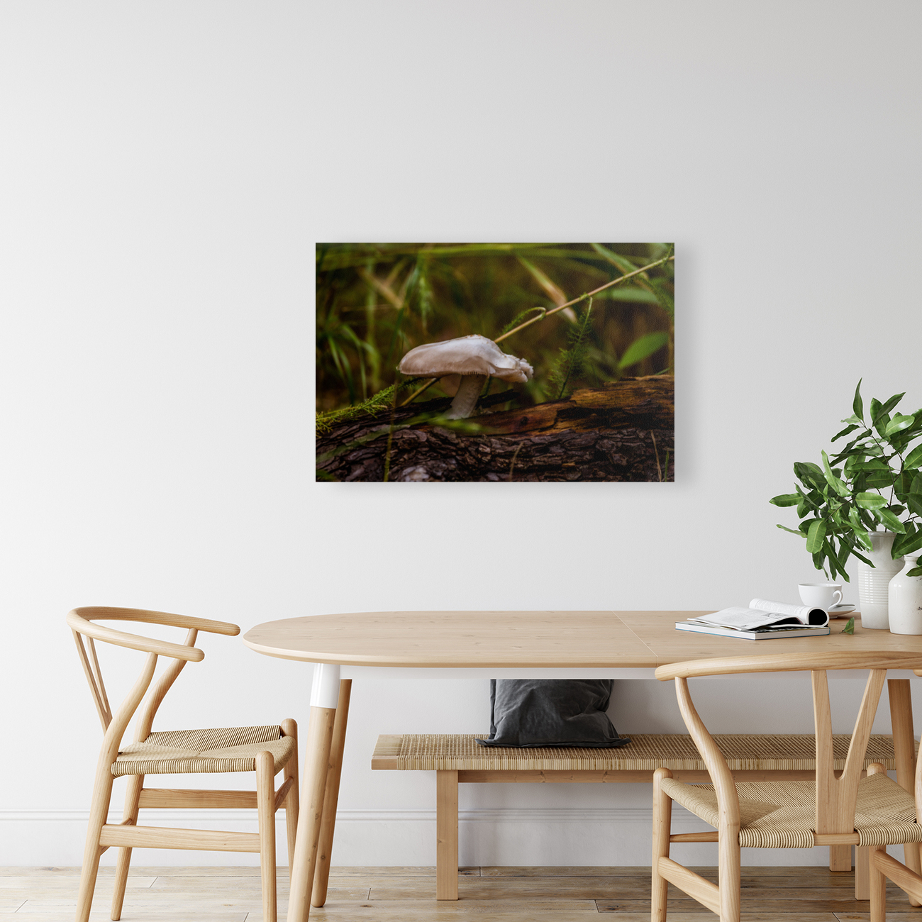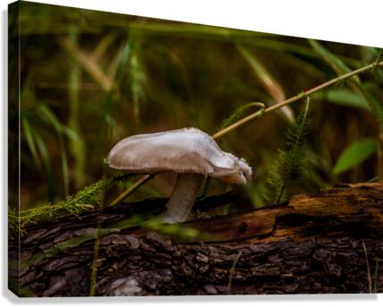 WHITE MUSHROOM GROWING ON A LOG APERTURE ADVENTURE DELANEY VAN  Canvas Print