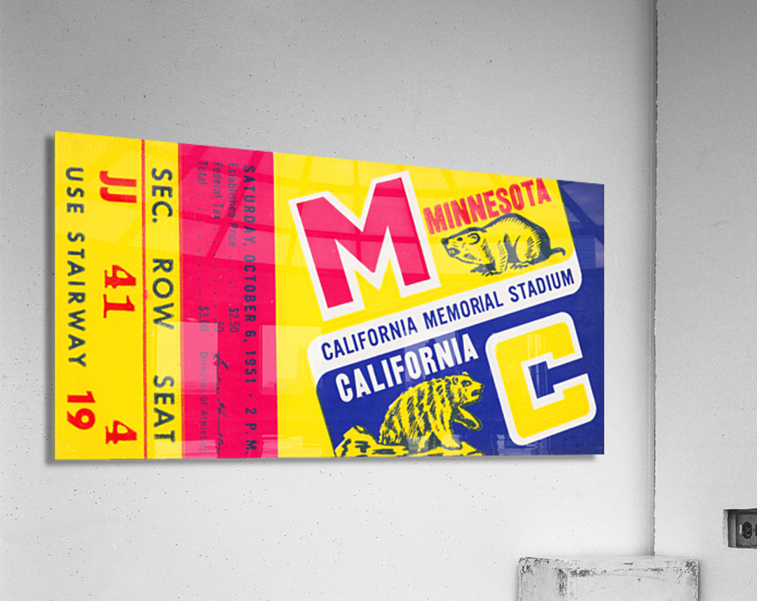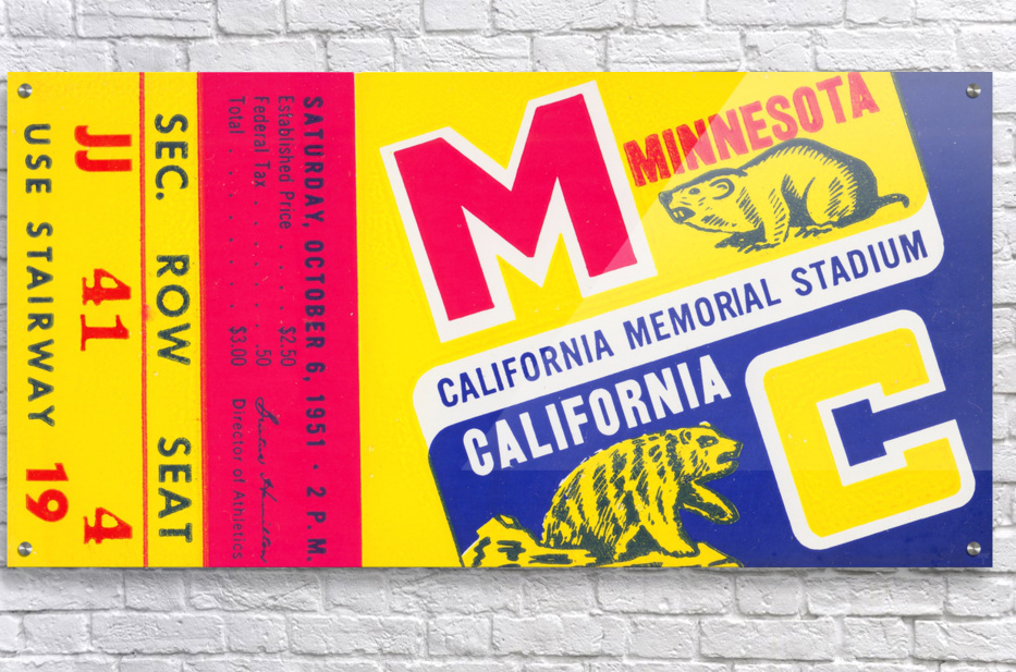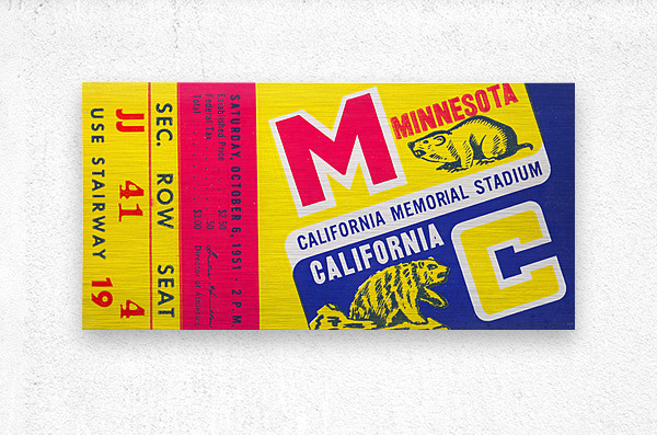 Row One Brand | 6,300 Historic Sports Prints | 2.3 Million Gallery Views | New! 1951 Cal Bears vs. Minnesota Golden Gophers Football Ticket Canvas Print | Row 1 | Pappy Waldorf's #2 ranked Cal Bear football team won by their biggest margin of victory in '51 beating Minnesota 55-14. This 1951 college football game was played at California Memorial Stadium in Berkeley. The Bears finished with an 8-2 record. This Row One Brand vintage college football ticket stub canvas print or ticket stub metal print will look terrific in your game room or office. Use our keyword search box to search more "college football art" or "1951 football" art. Row One Brand historic vintage college football ticket stub art prints are not affiliated with, licensed, sponsored, authorized, or endorsed by any college, university, team, league, other artist, athlete, other brand, or any licensing entity. Only non-copyrighted sports memorabilia art is used by Row One to create our historic sports wall art prints. Derivative art © 2021 Row One Brand | Watermark will not appear on final print