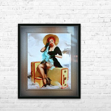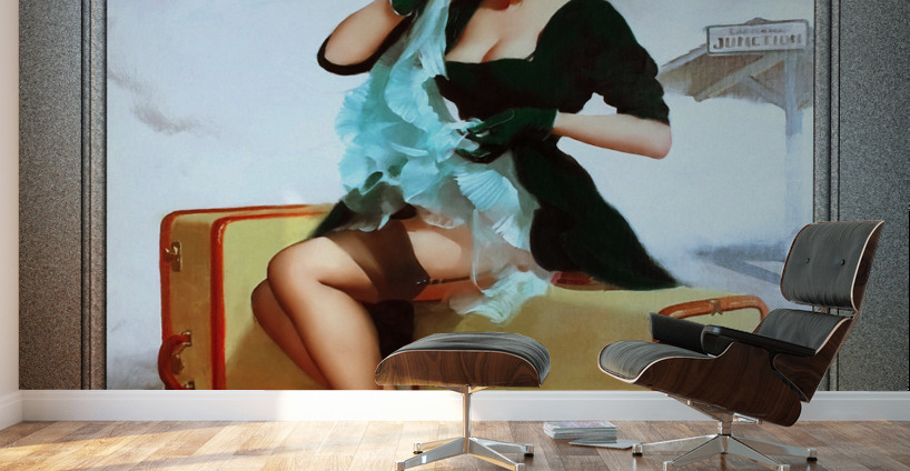 Welcome Traveler by American Painter Gil Elvgren (1914 - 1980); painter, illustrator and pin-up girl artist. A sexy pin up girl illustration featuring a young beautiful redhead that appears to have just come off of a locomotive with her three luggage bags. The luggage has been left on the wooden platform, and she is sitting on the widest one as the train has pulled out of the Junction Station; leaving trails of steam and smoke in its wake, while the beautiful young lady uses her sky blue ruffled slip to wipe something from the corner of her right eye. She is wearing a what appears to be a yellow straw sunhat, white pearl earrings, a white choker pearl necklace, a green dress, green gloves, sky blue slip and green strap tied high heel shoes. This is a retouched digital art old masters reproduction of a public domain image.