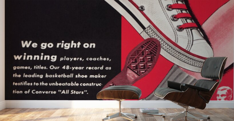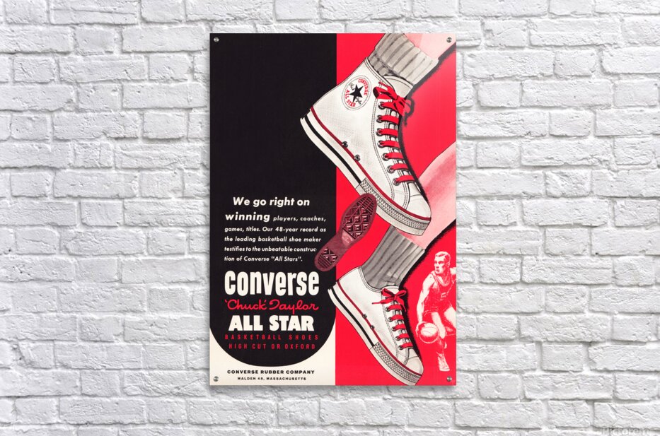 New! Vintage Converse Chuck Taylor Ad Metal Sign (1962) | 6,400 Historic Sports Prints & Gameday Advertising Art Prints | 2.4 Million Gallery Views | Row One Brand | This 1962 vintage Converse Chuck Taylor Shoes ad art will look great in your game room, kitchen, bath, or office. Row One's historic advertising wall art is not affiliated with, licensed, sponsored, authorized, or endorsed by any team, league, other artist, athlete, venue, other brand, or any licensing entity. Only non-copyrighted ads are used by Row One to create our historic gameday ad prints.