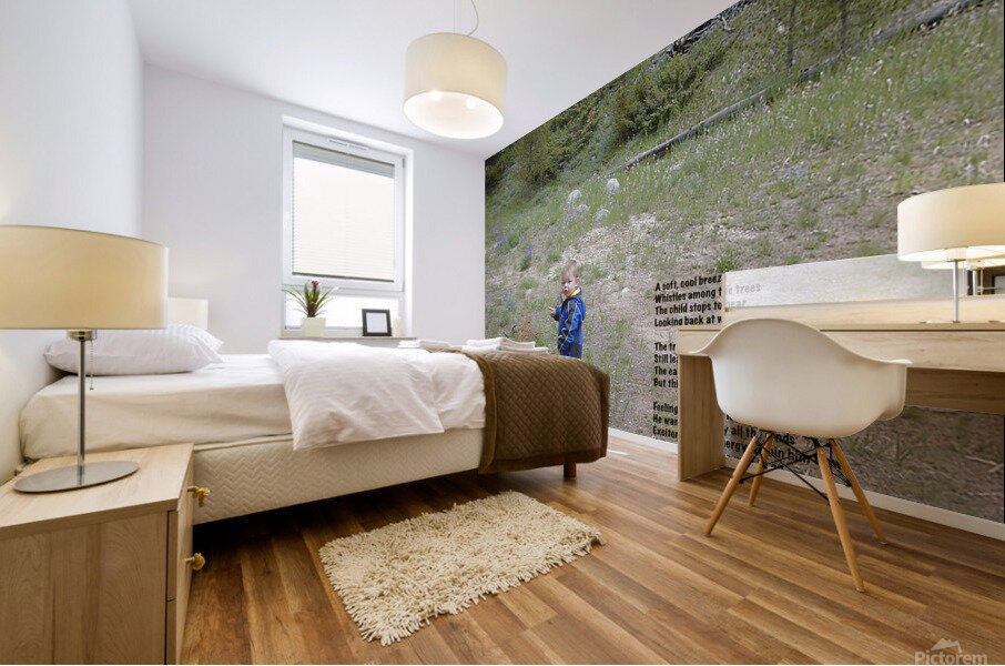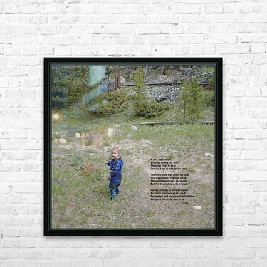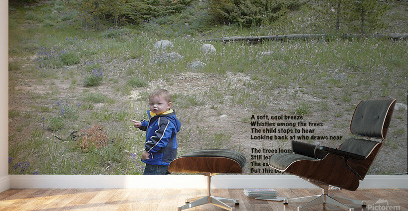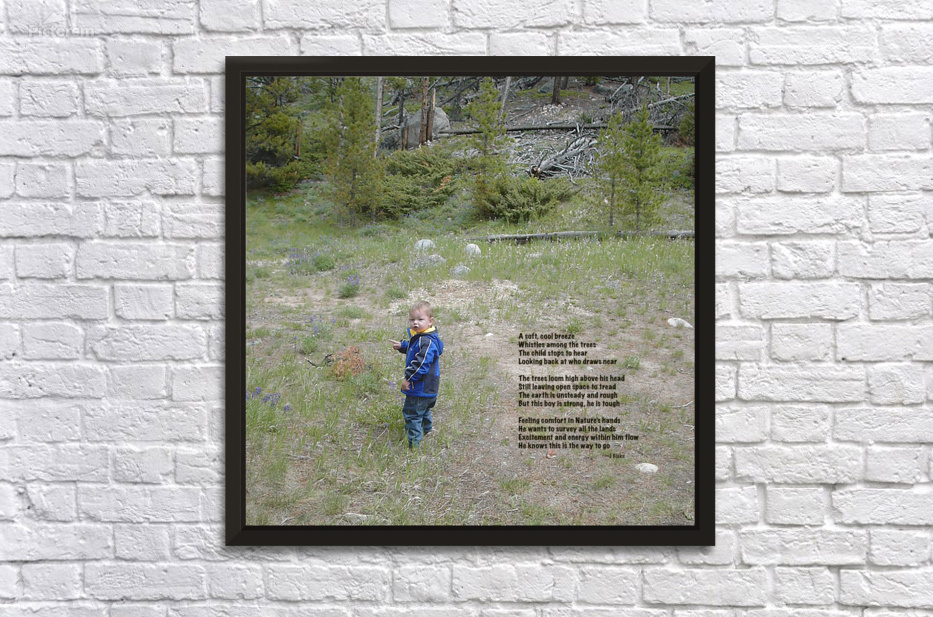The poem for Among the Trees reads: A soft, cool breeze Whistles among the trees The child stops to hear Looking back at who draws near The trees loom high above his head Still leaving open space to tread The earth is unsteady and rough But this boy is strong, he is tough Feeling comfort in Nature’s hands He wants to survey all the lands Excitement and energy within him flow He knows this is the way to go --J Blake