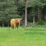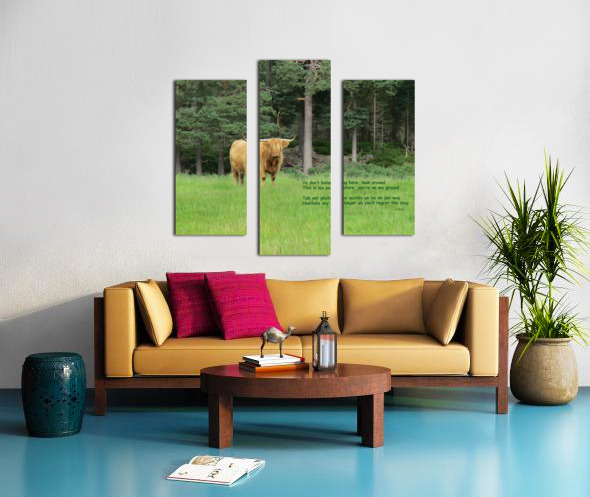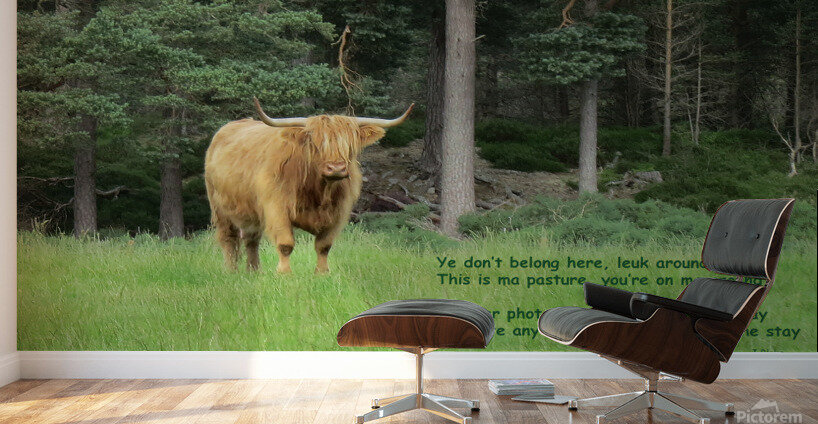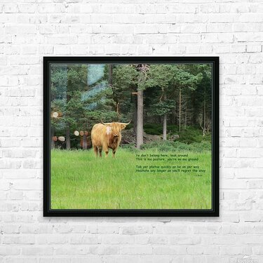 Scottish Bull poem reads: Ye don’t belong here, leuk around This is ma pasture, you’re on ma ground Tak yer photae quickly an be on yer way Hesit...[+]