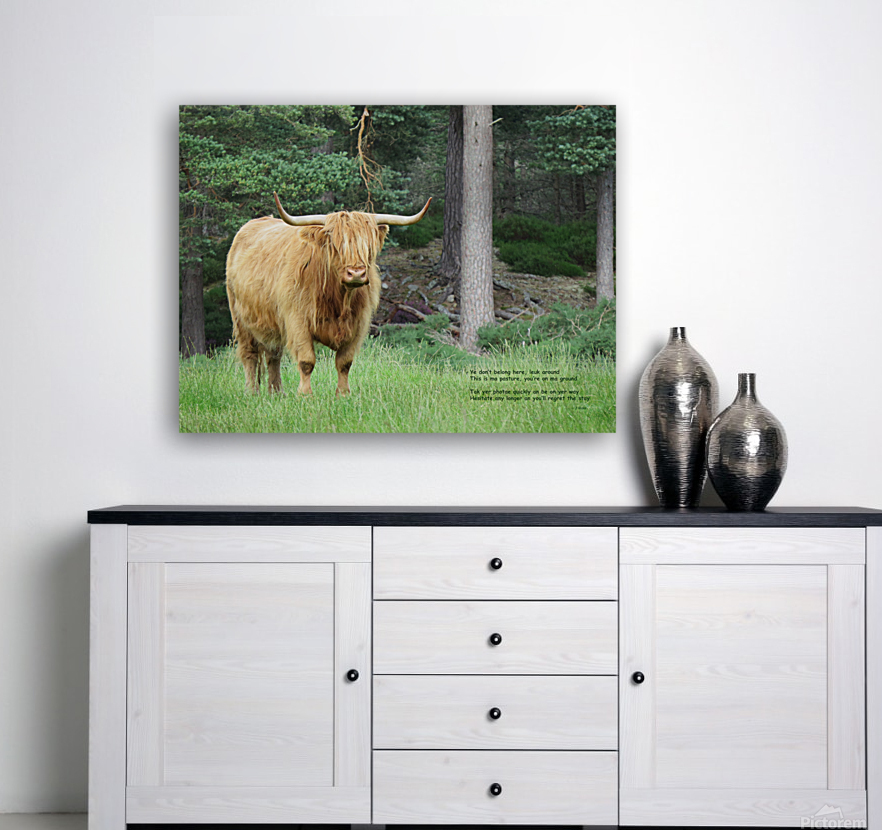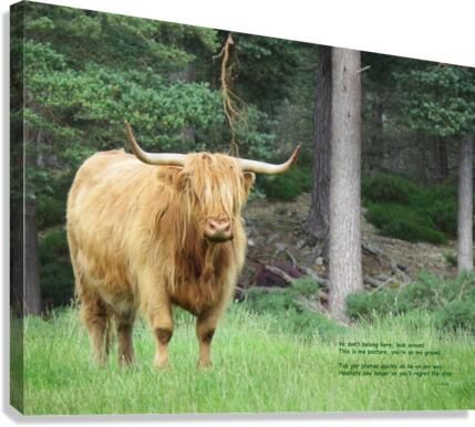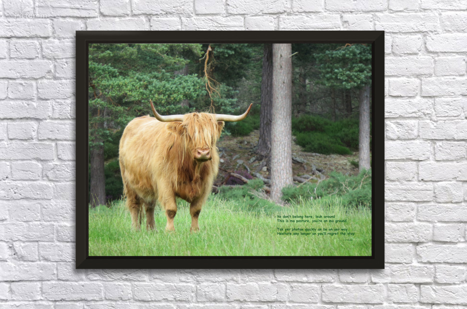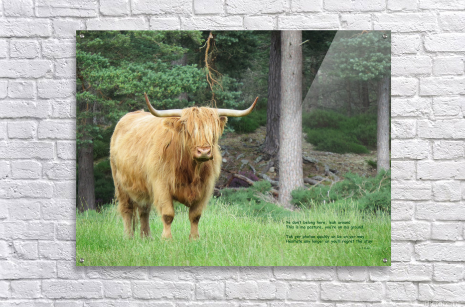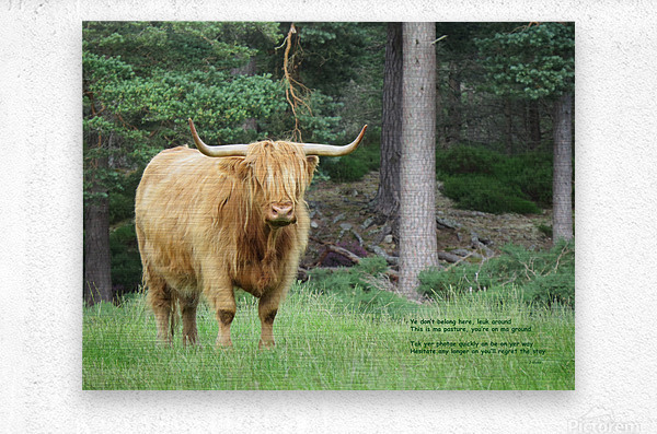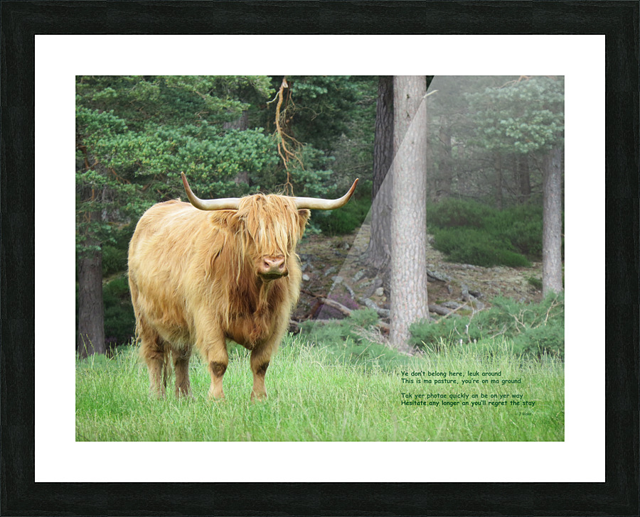 Scottish Bull poem reads: Ye don’t belong here, leuk around This is ma pasture, you’re on ma ground Tak yer photae quickly an be on yer way Hesit...[+]