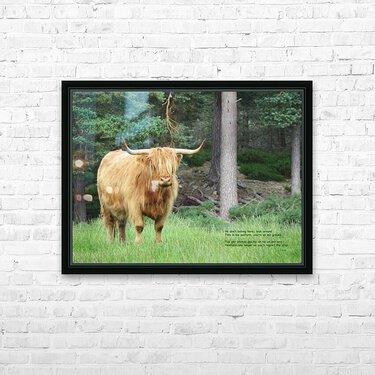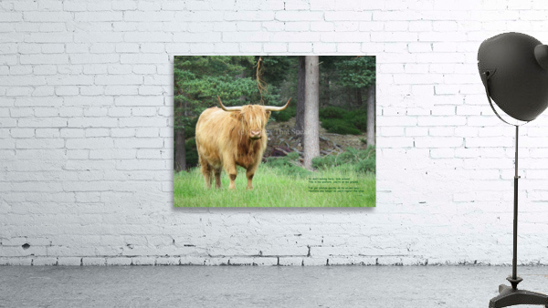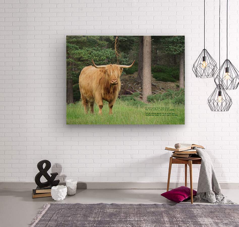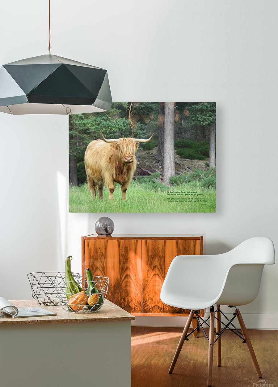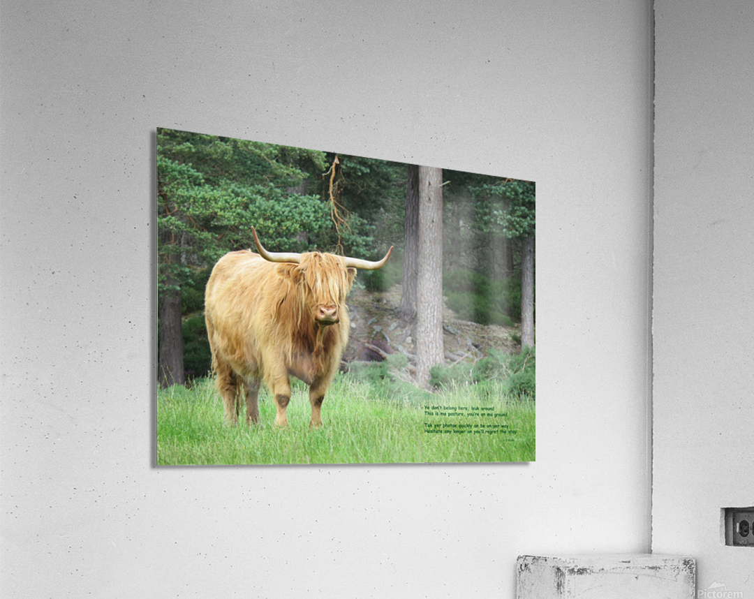 Scottish Bull poem reads: Ye don’t belong here, leuk around This is ma pasture, you’re on ma ground Tak yer photae quickly an be on yer way Hesit...[+]