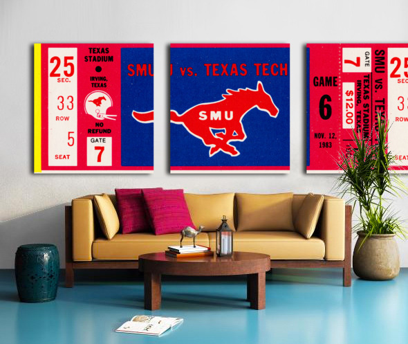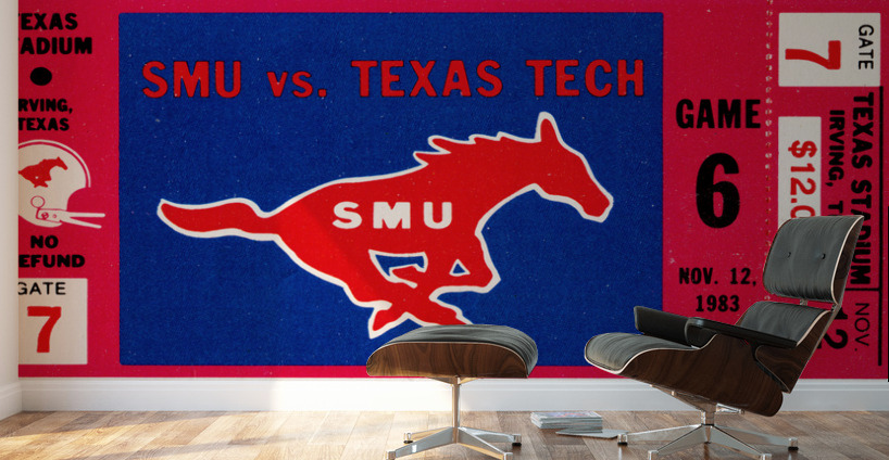 In this 1983 Southwest Conference game, the Mustangs won 33-12 over the Texas Tech Red Raiders at Texas Stadium in Irving, Texas. Row One Brand historic college football ticket stub prints are not affiliated with, licensed, sponsored, authorized, or endorsed by any college, university, team, league, other artist, athlete, other brand, or any licensing entity. Only non-copyrighted tickets and ticket stubs with expired copyrights are used by Row One to create our historic ticket prints. This memorabilia art is part of Row One Brand's historic sports art collection and may not be used for commercial purposes without permission from Row One. The contents of this website are copyright protected and punishable by federal law up to $150,000 for willful infringement. For use on a blog or news, please credit Row One Brand.