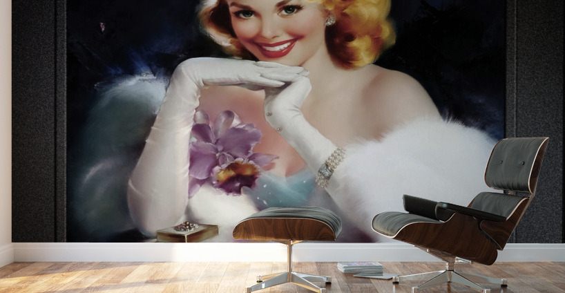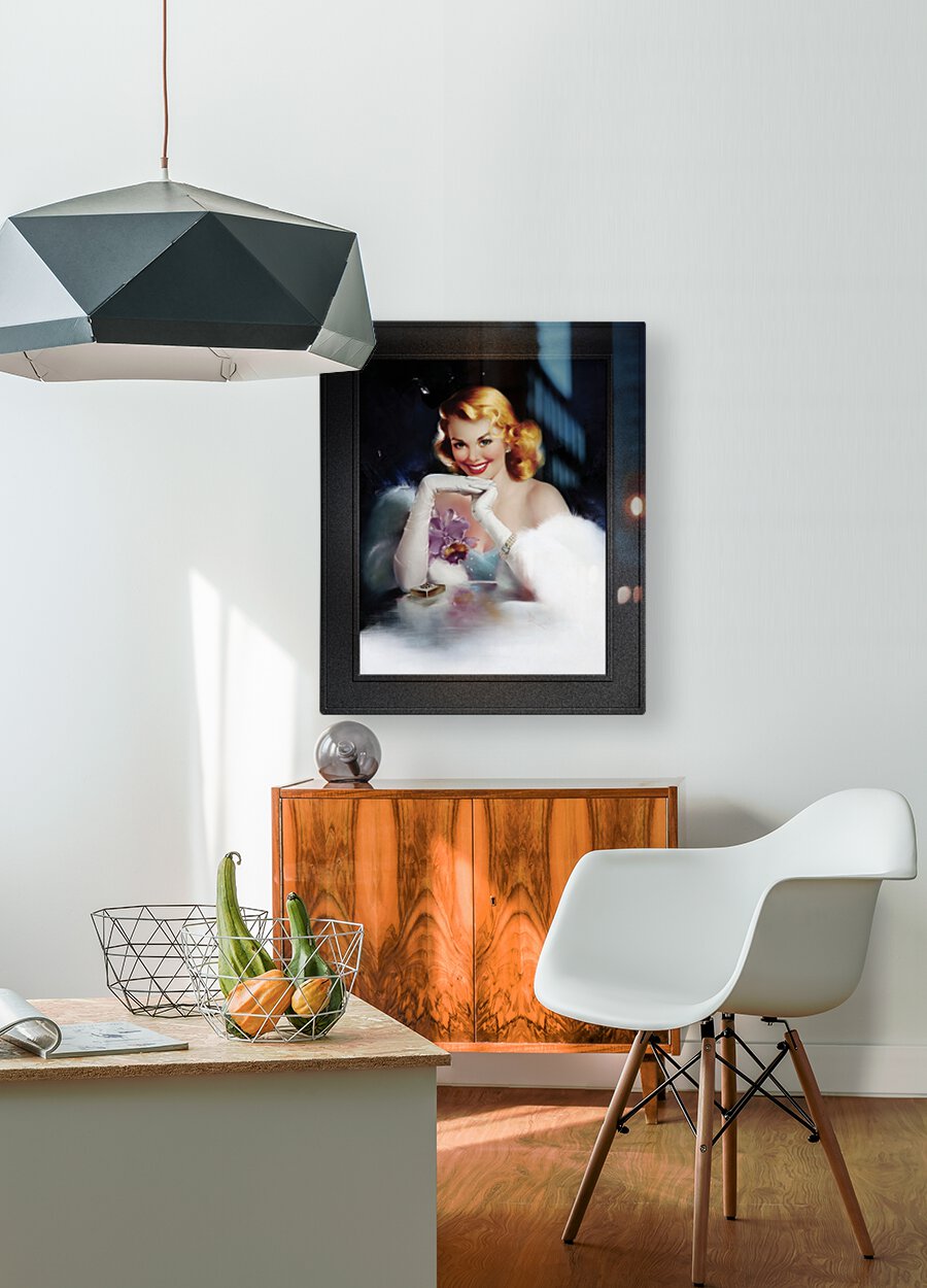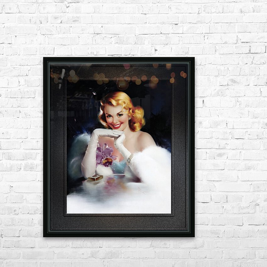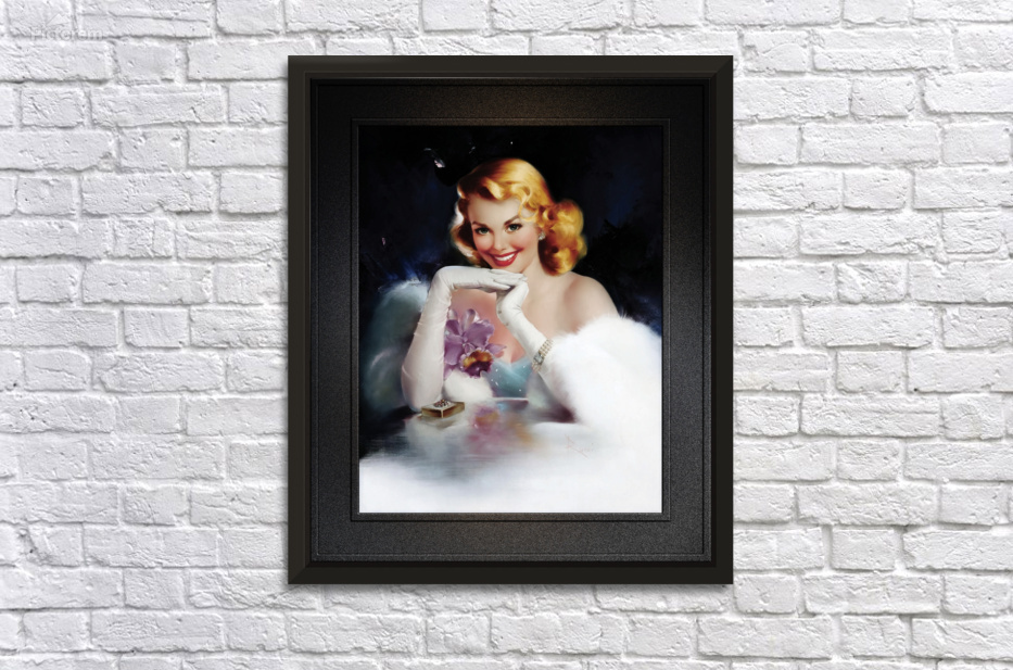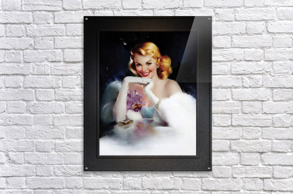 Surprise Gift by Italian Born American Artist Edward Runci (1921 - 1986); Painter, Illustration, Advertising and Pinup Artist of the early and mid 20th Century. A very attractive sexy blonde sits at a glass table with a gold gift box that is adorned with jewels on the top cover. She is wearing pearl earrings, a three tier pearl bracelet, long arms length white evening gloves with round pearl buttons. She is dressed in a light blue sheer dress with white sparkles, and has a purple orchid with a matching ribbon bow to the right chest area of her dress; and has a white mink jacket wrapped around her arms and back. All this is set against a blue and black background with white highlights and a far removed light source that is illuminating part of the right side of her hair from below.