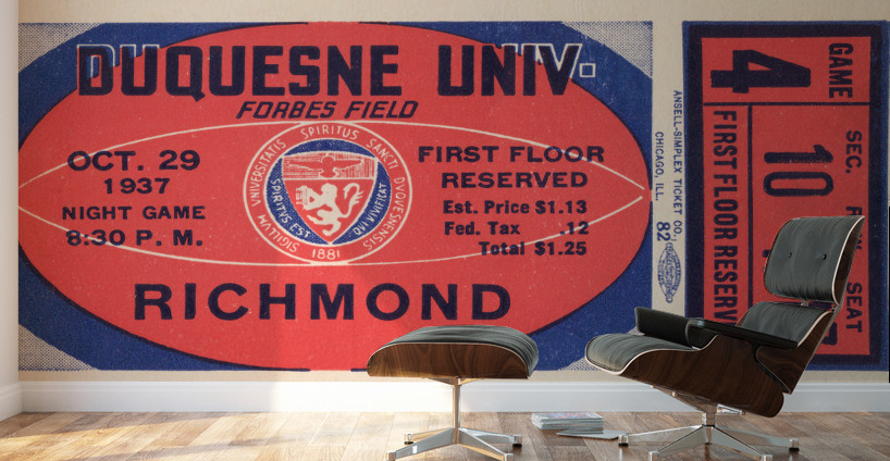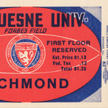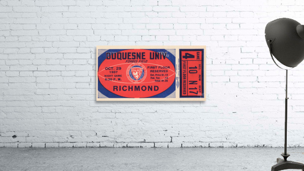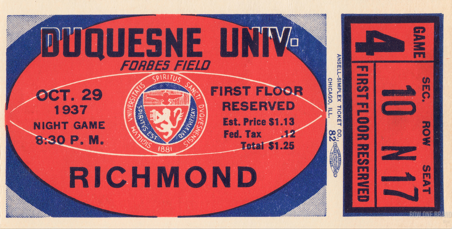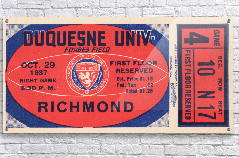 Coming off an Orange Bowl Championship season in 1936, the Duquesne Dukes beat Richmond 24-0 at historic Forbes Field in Pittsburgh. Digitally restored for vibrant color, this Row One Brand vintage college football ticket stub print will look fantastic in your game room or office. Row One Brand historic college football ticket stub art prints are not affiliated with, licensed, sponsored, authorized, or endorsed by any college, university, team, league, other artist, athlete, other brand, or any licensing entity. Only non-copyrighted tickets and ticket stubs with expired copyrights are used by Row One to create our historic ticket prints. This ticket stub memorabilia art is part of Row One Brand's historic sports ticket stub art collection. The contents of this website are copyrighted and punishable by federal law up to $150,000 for willful infringement. For use on a blog or news, please credit Row One Brand.