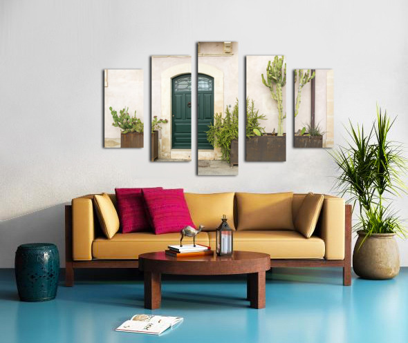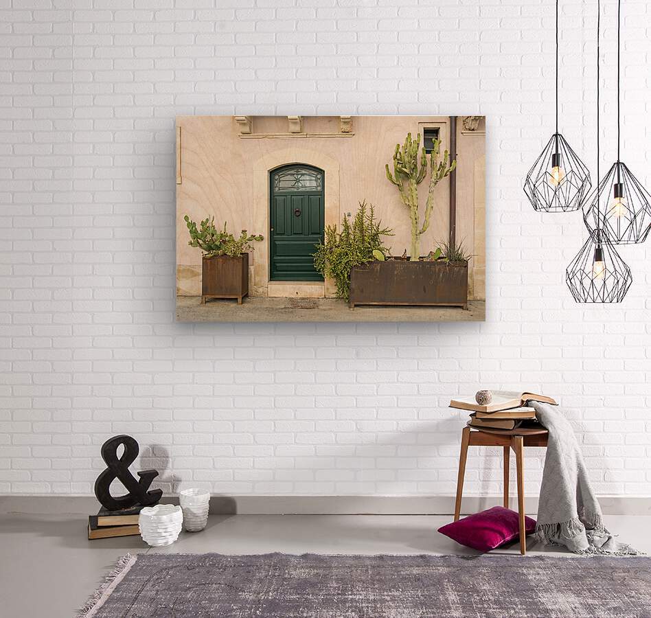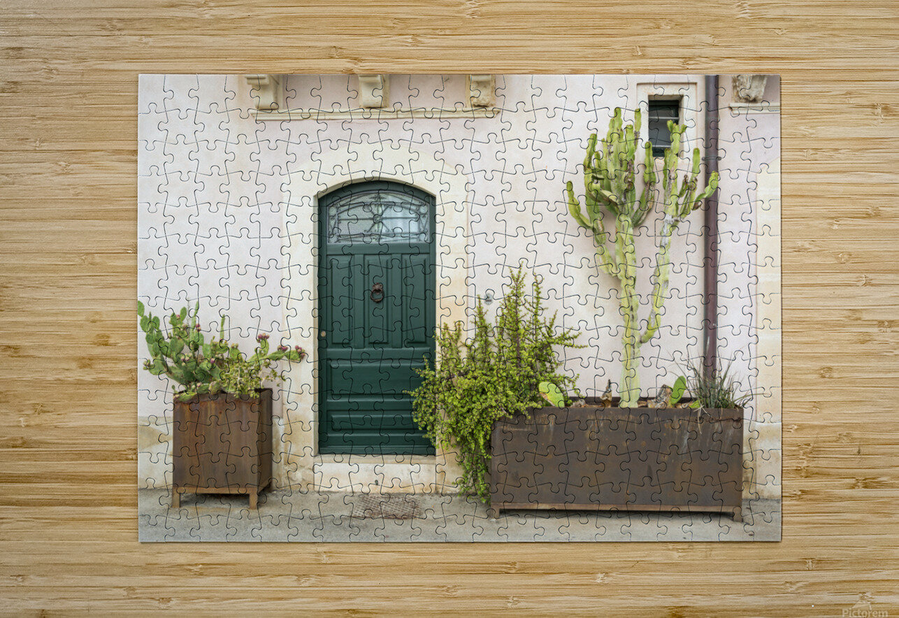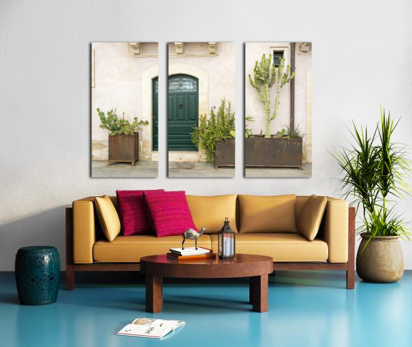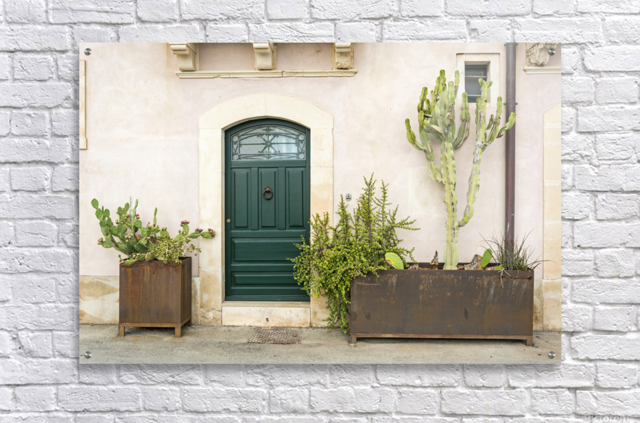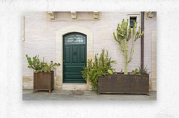 Façade of typical town house with green cactuses and old door in a Mediterranean city Syracuse on Sicily Italy