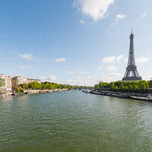PARIS AND EIFFEL TOWER WITH RIVER SEINE IN THE FOREGROUND ON A SUNNY DAY