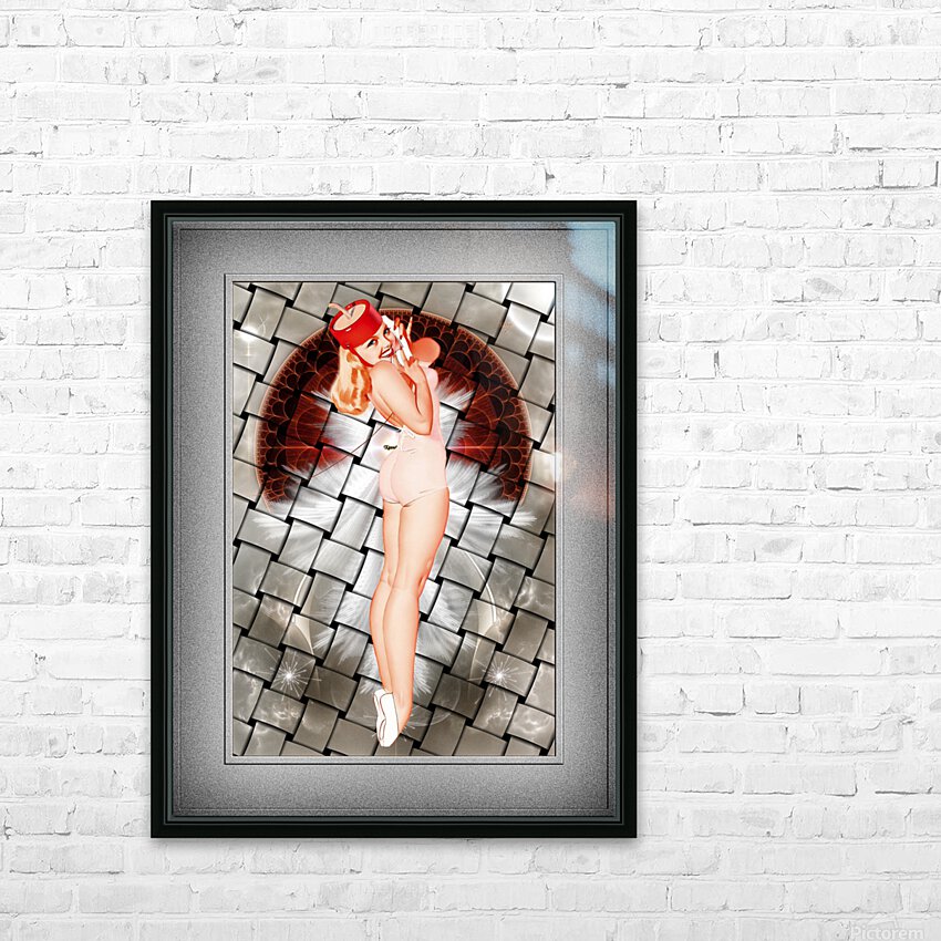 Bell Hop Pinup Girl Calendar Illustration by American Painter George Brown Petty IV (1894 - 1975); Magazine Illustrator and Pinup Artist of the 1930s, 40s and 50s This is a sexy pinup girl calendar illustration of long legged golden blonde in a one piece swimsuit, white flat shoes and a red bell hops hat that is talking on the handset of a 1930s phone; with the line cord blowing in the wind. After repairing the image I decided to replace the plain white background with my Fractal Art Composition Angel Snowflake with a ribbon weaved offset, that complements the beautiful model perfectly.