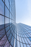 Blue curved glass skyscraper facade reflections against sky