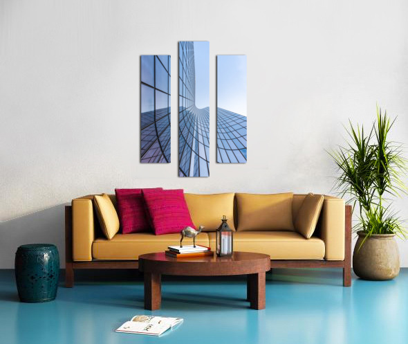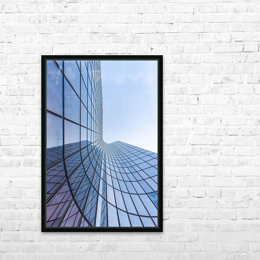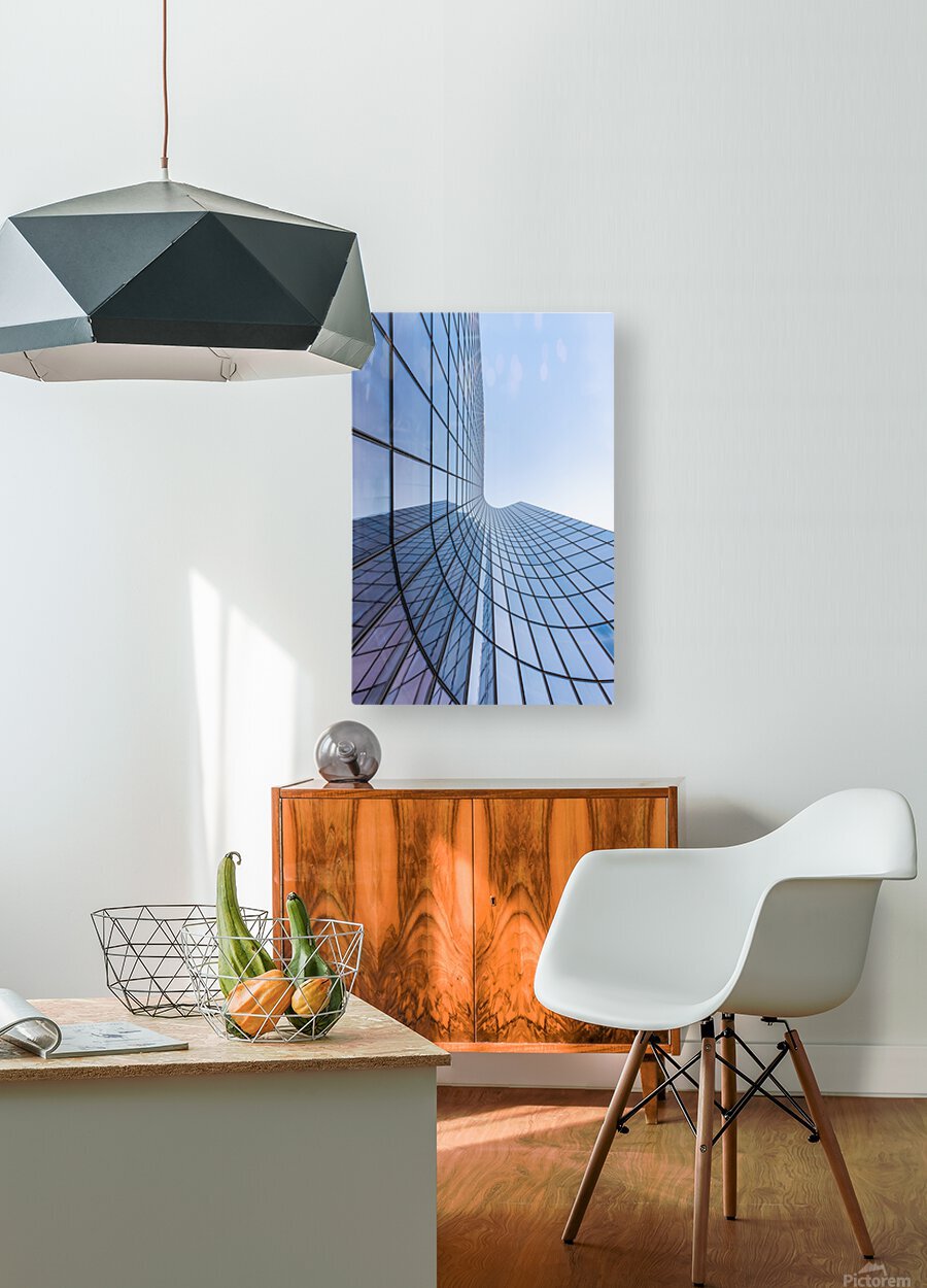 ABOUT THIS ARTWORK: BLUE CURVED GLASS SKYSCRAPER FACADE AGAINST SKY