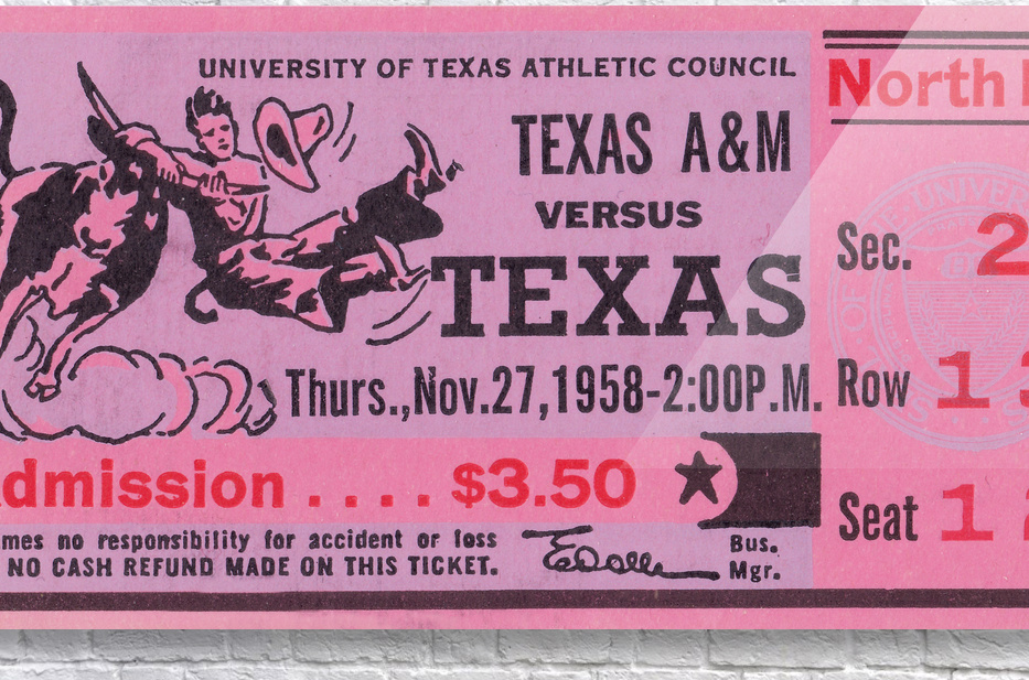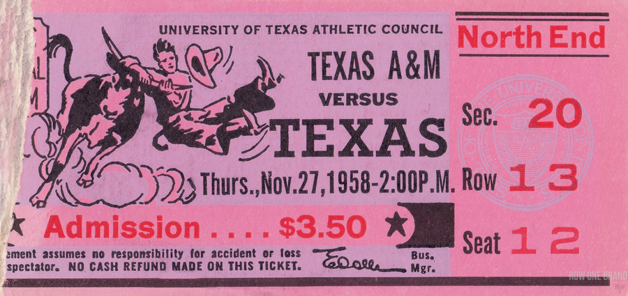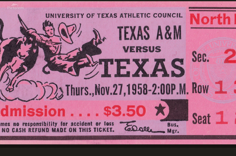 ABOUT THIS ARTWORK: 1958 TEXAS AM VS. TEXAS LONGHORNS FOOTBALL TICKET ART