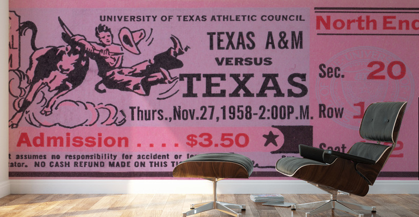 In Coach Darrell Royal's first home game against rival Texas A&M, the Longhorns beat the Aggies 27-0 in Austin. This vintage Texas Longhorns football ticket print will always be a conversation piece and Row One's vintage college football ticket art will look great on your walls. Row One Brand historic college football ticket stub art prints are not affiliated with, licensed, sponsored, authorized, or endorsed by any college, university, team, league, other artist, athlete, other brand, or any licensing entity. Only non-copyrighted tickets and ticket stubs with expired copyrights are used by Row One to create our historic ticket prints. This ticket stub memorabilia art is part of Row One Brand's historic sports ticket stub art collection. The contents of this website are copyrighted and punishable by federal law up to $150,000 for willful infringement. For use on social media, a blog or news, please credit Row One Brand