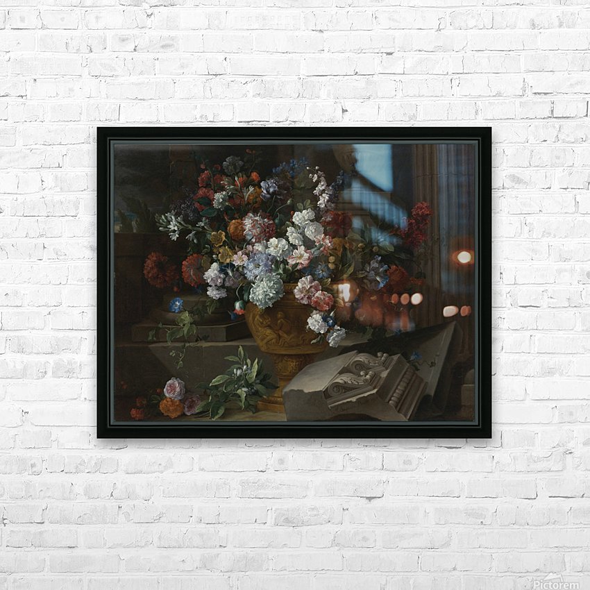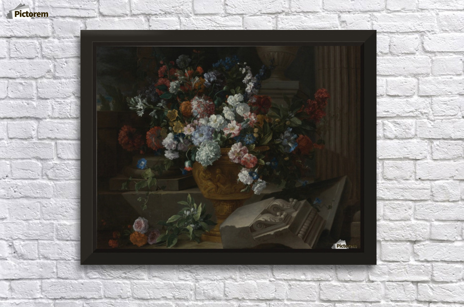 Get this artwork "Still life with flowers in a sculpted urn with architectural fragments on a terrace" in a framed print.