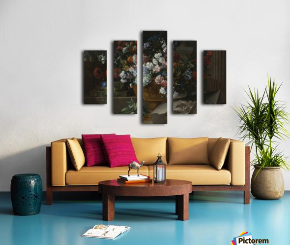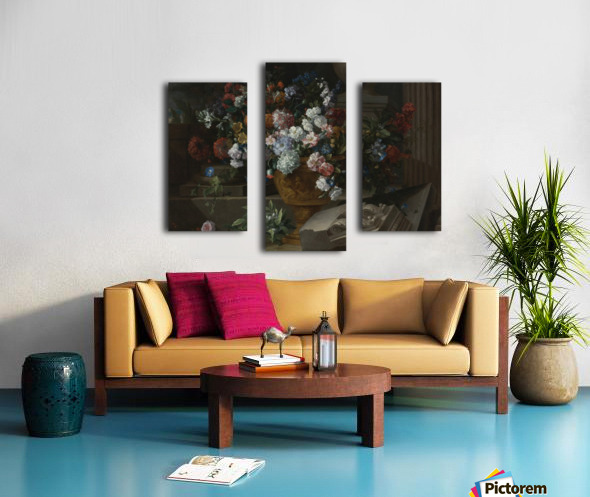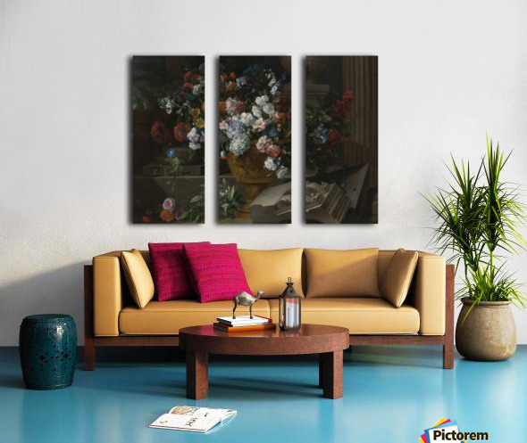 Still life with flowers in a sculpted urn with architectural fragments on a terrace Canvas print