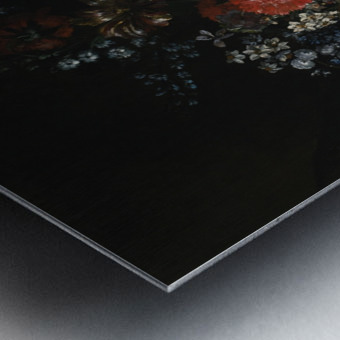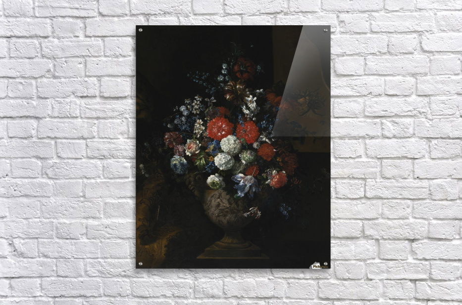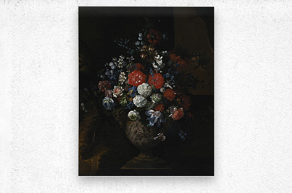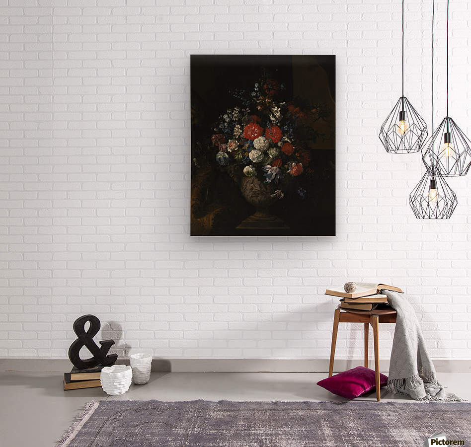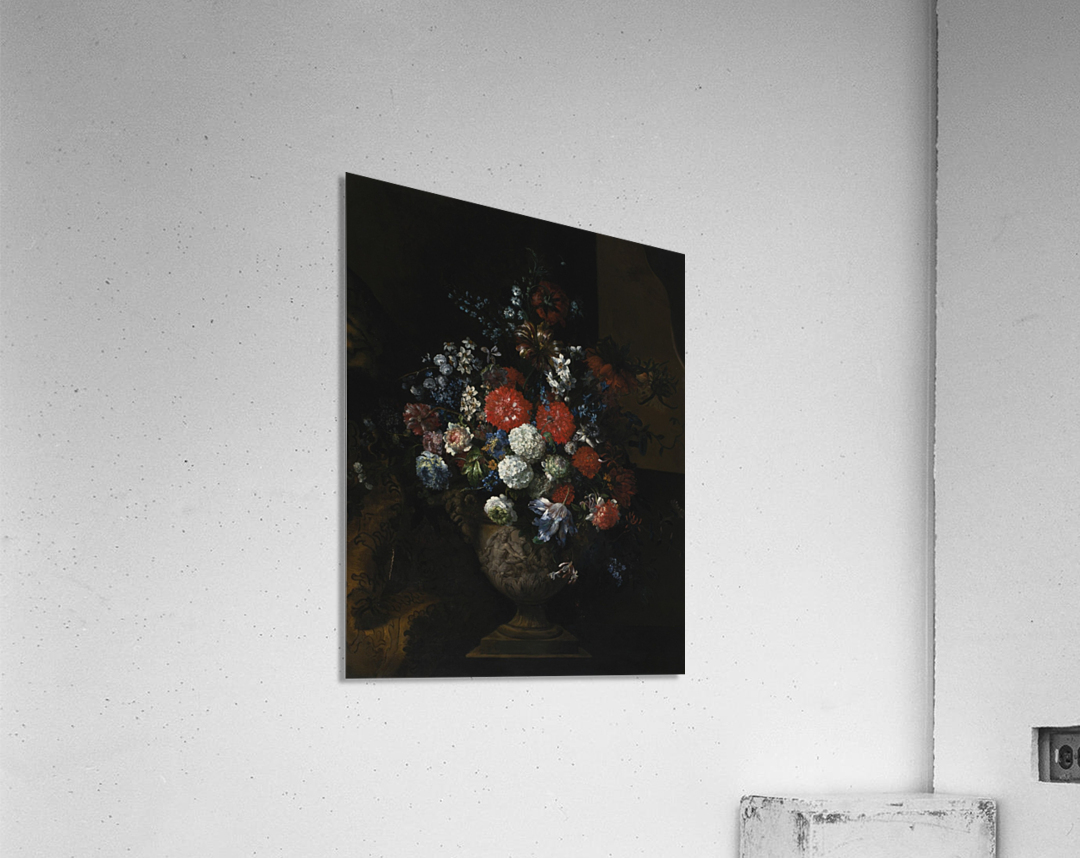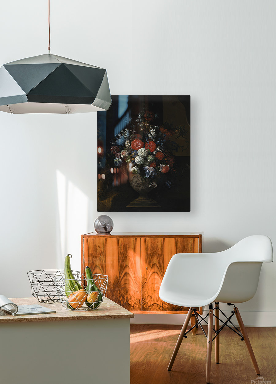 Still life of flowers, including tulips, roses, poppies and viburnum in a sculpted urn,resting on a stone plinth  HD Metal print with Floating Frame on Back