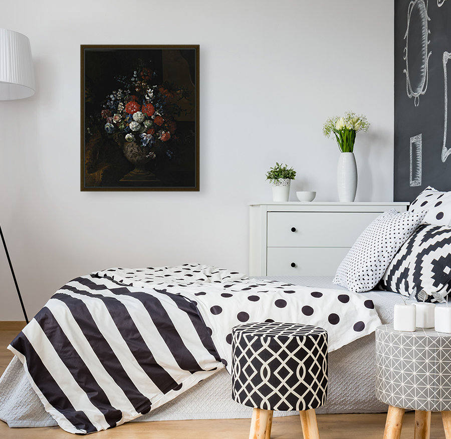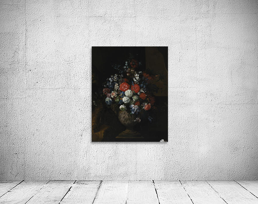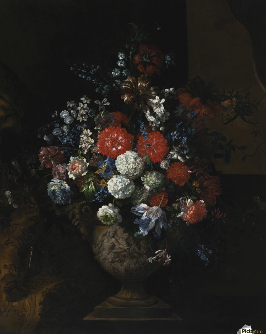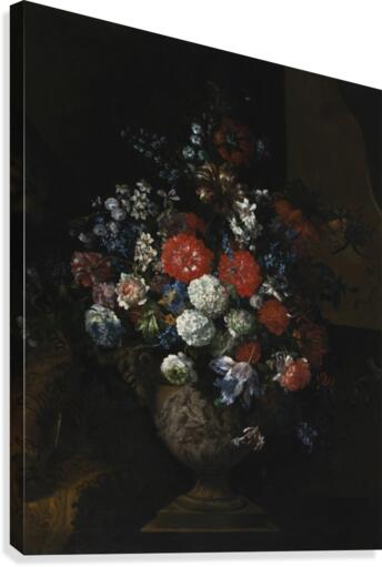 STILL LIFE OF FLOWERS, INCLUDING TULIPS, ROSES, POPPIES AND VIBURNUM IN A SCULPTED URN,RESTING ON A STONE PLINTH JEAN BAPTISTE MONNOYER  Canvas Print