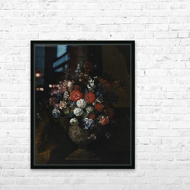 Still life of flowers, including tulips, roses, poppies and viburnum in a sculpted urn,resting on a stone plinth Wall Decor Frame