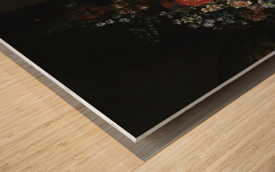 Still life of flowers, including tulips, roses, poppies and viburnum in a sculpted urn,resting on a stone plinth Wood print