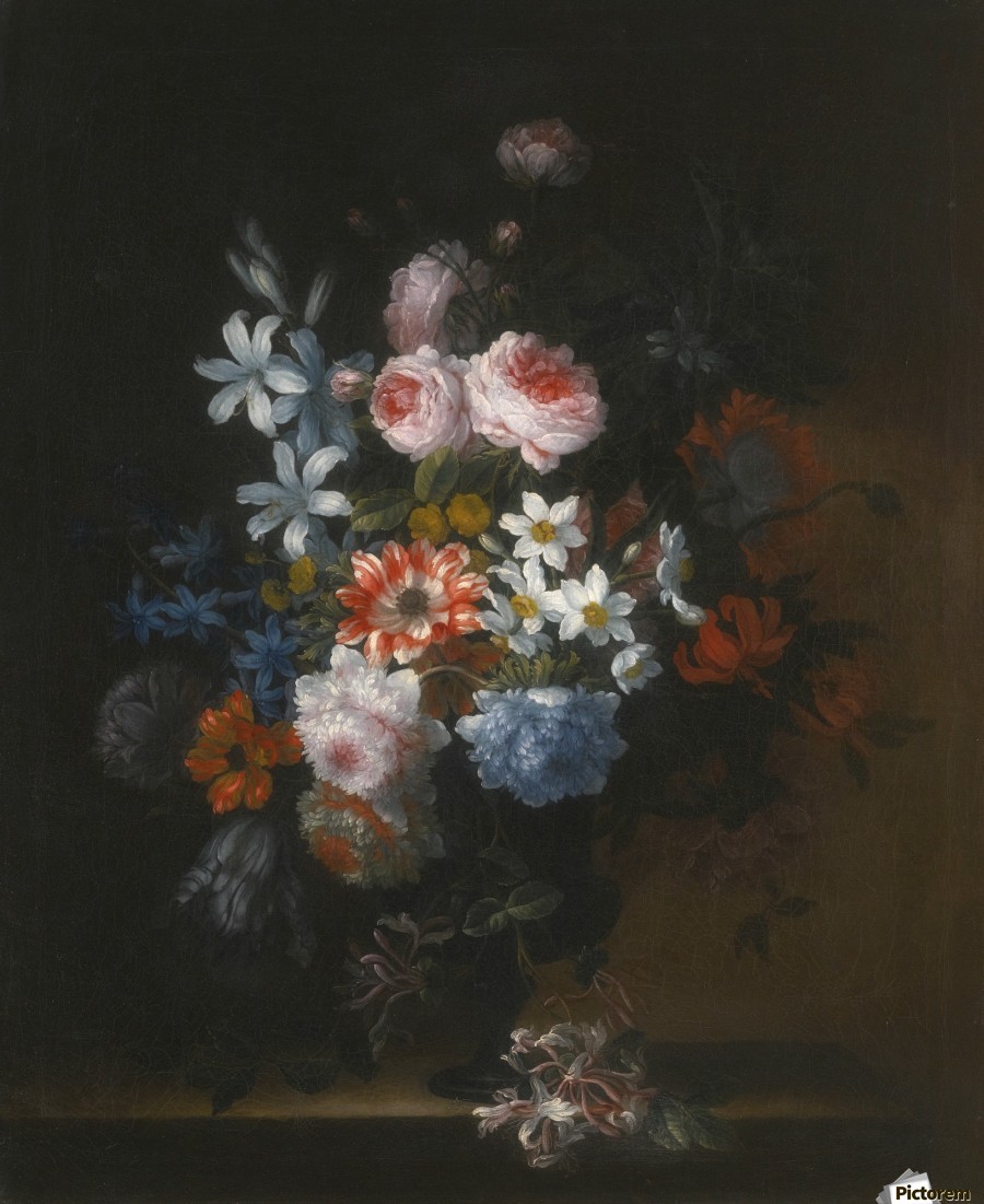 STILL LIFE OF ROSES, HONEYSUCKLE, LILLIES, CHRYSANTHEMUMS, NARCISSI AND OTHER FLOWERS IN A VASE JEAN BAPTISTE MONNOYER  Canvas Print