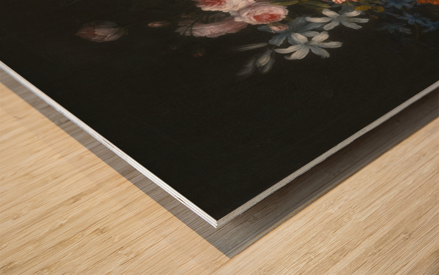 Still life of roses, honeysuckle, lillies, chrysanthemums, narcissi and other flowers in a vase  Wood print