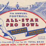 The Western Conference beat the Eastern Conference 19-10 in the 1957 Pro Bowl game played in Los Angeles at the LA Coliseum. This was the last Pro Bowl that wasn't televised. Digitally restored for vibrant color, this Row One Brand vintage 1957 Pro Bowl football ticket print will look fantastic in your game room or office. Row One Brand's historic pro football ticket art prints are not affiliated with, licensed, sponsored, or endorsed by any team, league, artist, athlete, other brand, venue, or any licensing entity. Only non-copyrighted memorabilia publications in the public domain or art with an expired copyright is used by Row One to create our historic sports art prints. This vintage ticket is part of Row One's historic ticket collection. The contents of this website are copyrighted and punishable by federal law up to $150,000 for willful infringement. For use on social media, a blog, or news, please credit Row One Brand.