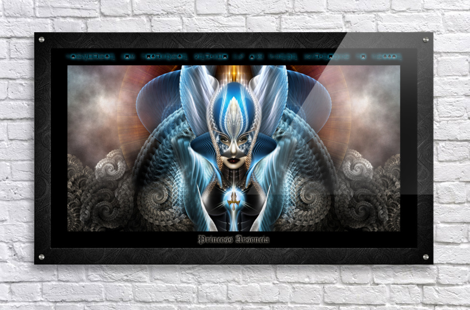 Princess Arsencia - The Symbols Of Arnoontraak is a fractal art portrait composition from 2014 that is a variant of my original piece that I most likely created as a marketing piece at the time. This variant is derived from the Arsencia Battled Dress Portrait XT On Black; which removed the gothic wall background of the original Battle Dress piece and then integrates the typography symbols I used in the variant The Mystery of Arsencia. This trimmed down variant only focuses on the view from her waist to just above her head and trims off about thirty percent of the swirling seashell fractals on either side and adds a border with 3D symbols highlighted in blue at the top and her name and title at the bottom highlighted in white.