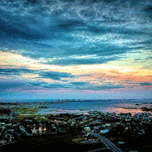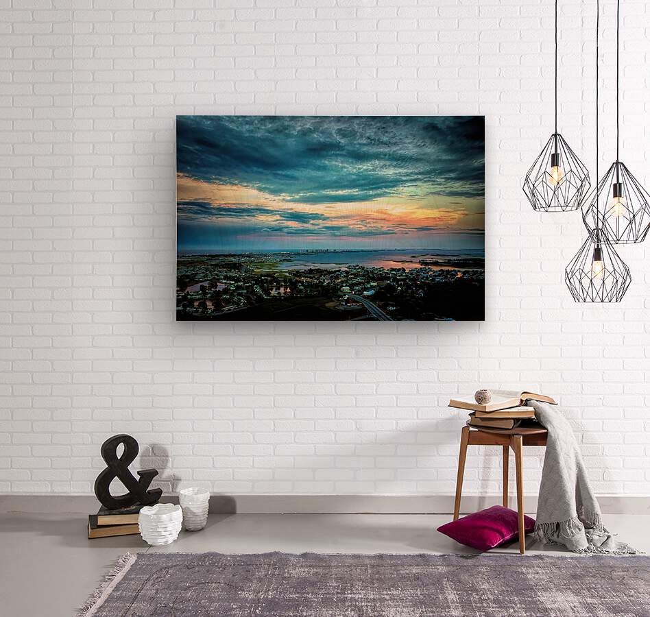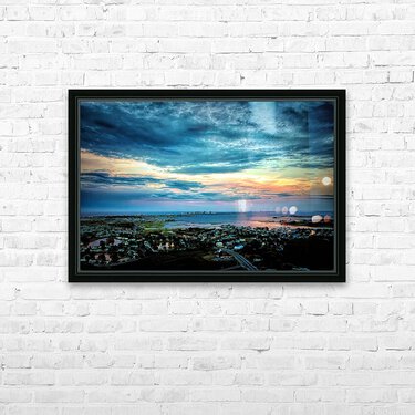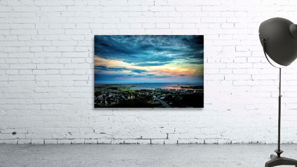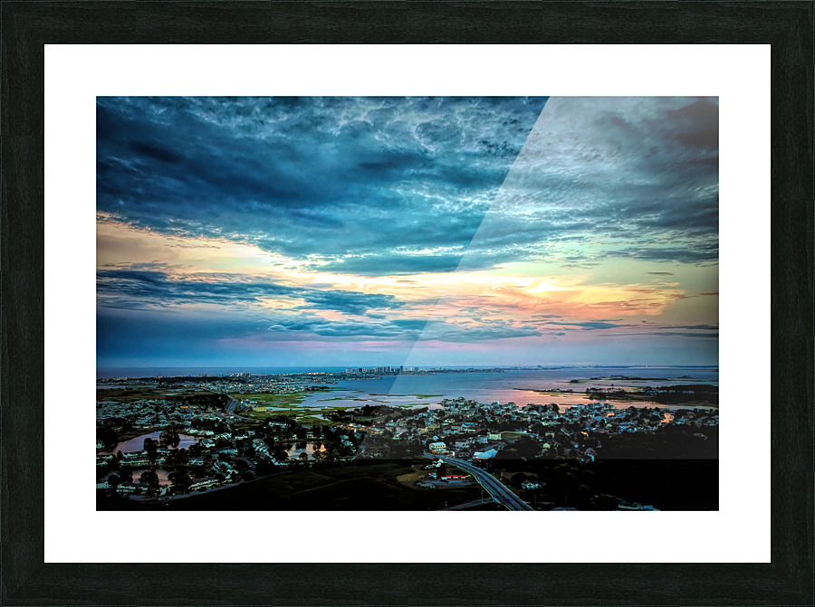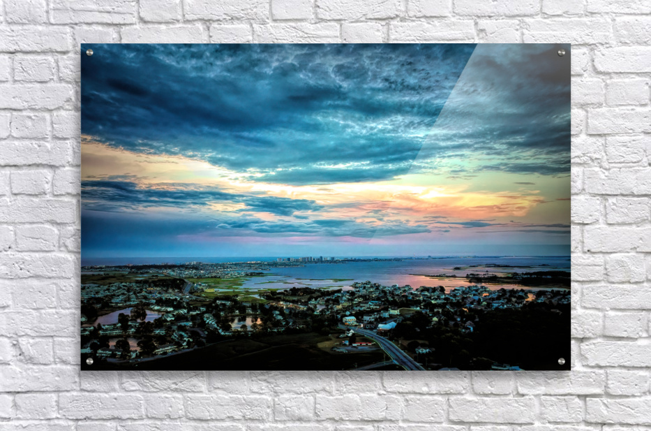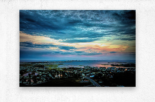 The skyline of Ocean City, Maryland and Fenwick Island, Delaware is colorfully lit by the setting sun over the Delmarva Peninsula in the west . This photograph was captured from 350 feet in altitude over the community of West Fenwick and, looking toward the southeast, actually shows about 10 miles of shoreline along the coast. Assawoman Bay is the body of water in the foreground and the Atlantic Ocean. of course, is in the distance beyond the row of buildings on the island.