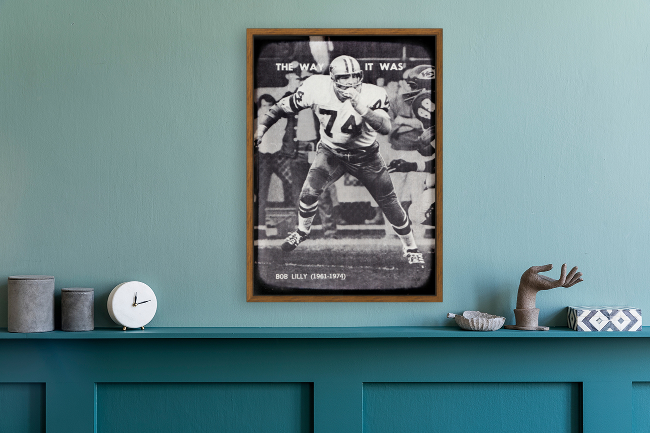Dallas Cowboy Star Bob Lilly Photo Art | Row One Brand | This Dallas Cowboys photo art has been designed to look like a vintage viewfinder slide. Row One's Bob Lilly art will look fantastic in your game room or office. Derivative art © 2022 Row One Brand Row One Brand's historic pro sports art prints are not affiliated with, licensed, sponsored, or endorsed by any team, league, artist, athlete, other brand, venue, or any licensing entity. Only non-copyrighted memorabilia art in the public domain or art with an expired copyright is used by Row One to create our historic sports art prints. This vintage sports photo art is part of Row One's historic sports art collection. The contents of this website are copyrighted and punishable by federal law up to $150,000 for willful infringement. For use on social media, a blog, or news, please credit Row One Brand. This wall art was created from a historic photo published in the 1970's with no copyright notice.