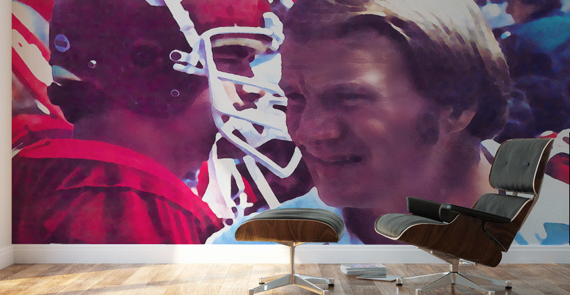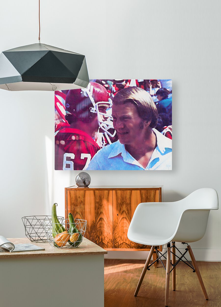 Coach Switzer on the Sidelines | Football Gameday in Norman | 1980 Oklahoma Sooners Watercolor Football Art | Row One Brand | Barry Switzer is one of the winningest coaches in college football history and won three National Championships as well as a Super Bowl with the Dallas Cowboys. Created from an authentic 1980 Oklahoma football photo in our collection, this Row One Brand Oklahoma Sooners football art will look fantastic in your game room or office. Look for the Row 1 trademark for college art created from historic collegiate memorabilia. Derivative art © 2022 Row One Brand Row One Brand's historic college football art prints are not affiliated with, licensed, sponsored, or endorsed by any college, university, pro team, league, artist, athlete, other brand, venue, or any licensing entity. Only historic non-copyrighted memorabilia publications in the public domain or art with an expired copyright is used by Row One to create our historic sports art prints. This vintage art is part of Row One's historic college art collection. The contents of this website are copyrighted and punishable by federal law up to $150,000 for willful infringement. For use on social media, a blog, or news, please credit Row One Brand. This artwork was created from a 1980 photo published with no copyright notice.
