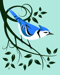 Stylized bird a design of a Blue Jay on a tree branch with leaf pattern in background