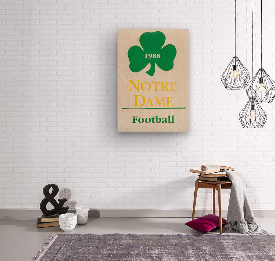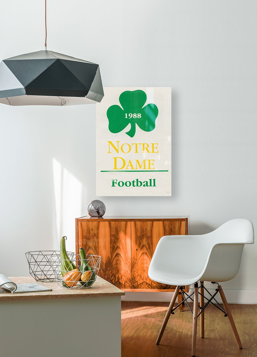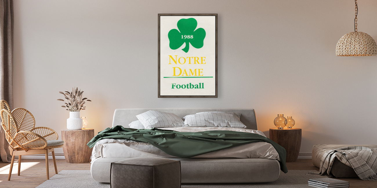 1988 Notre Dame Football Shamrock Art | Row One Brand | Historic College Football Art Collection | Lou Holtz led the Irish to the 1988 National Title by going 12-0 and beating West Virginia in the Fiesta Bowl. Created from authentic 1988 Notre Dame football memorabilia in our Collection | Meticulously cropped for aesthetics, this Row One Brand retro Notre Dame football art will look fantastic in your game room or office. Row One Brand's historic college football art prints are not affiliated with, licensed, sponsored, or endorsed by any college, university, pro team, league, artist, athlete, other brand, venue, or any licensing entity. Only historic non-copyrighted memorabilia publications in the public domain or art with an expired copyright is used by Row One to create our historic sports art prints. This vintage art is part of Row One's historic college art collection. The contents of this website are copyrighted and punishable by federal law up to $150,000 for willful infringement. For use on social media, a blog, or news, please credit Row One Brand. This art was created from 1988 memorabilia artwork published with no copyright notice.