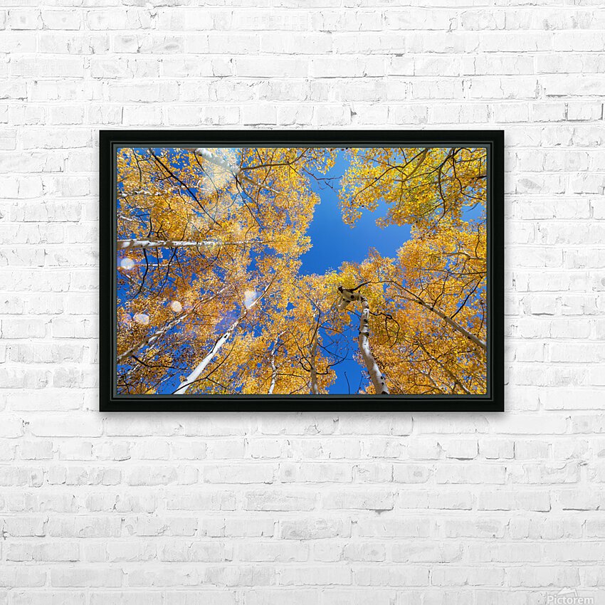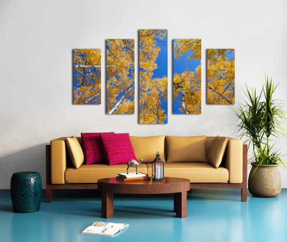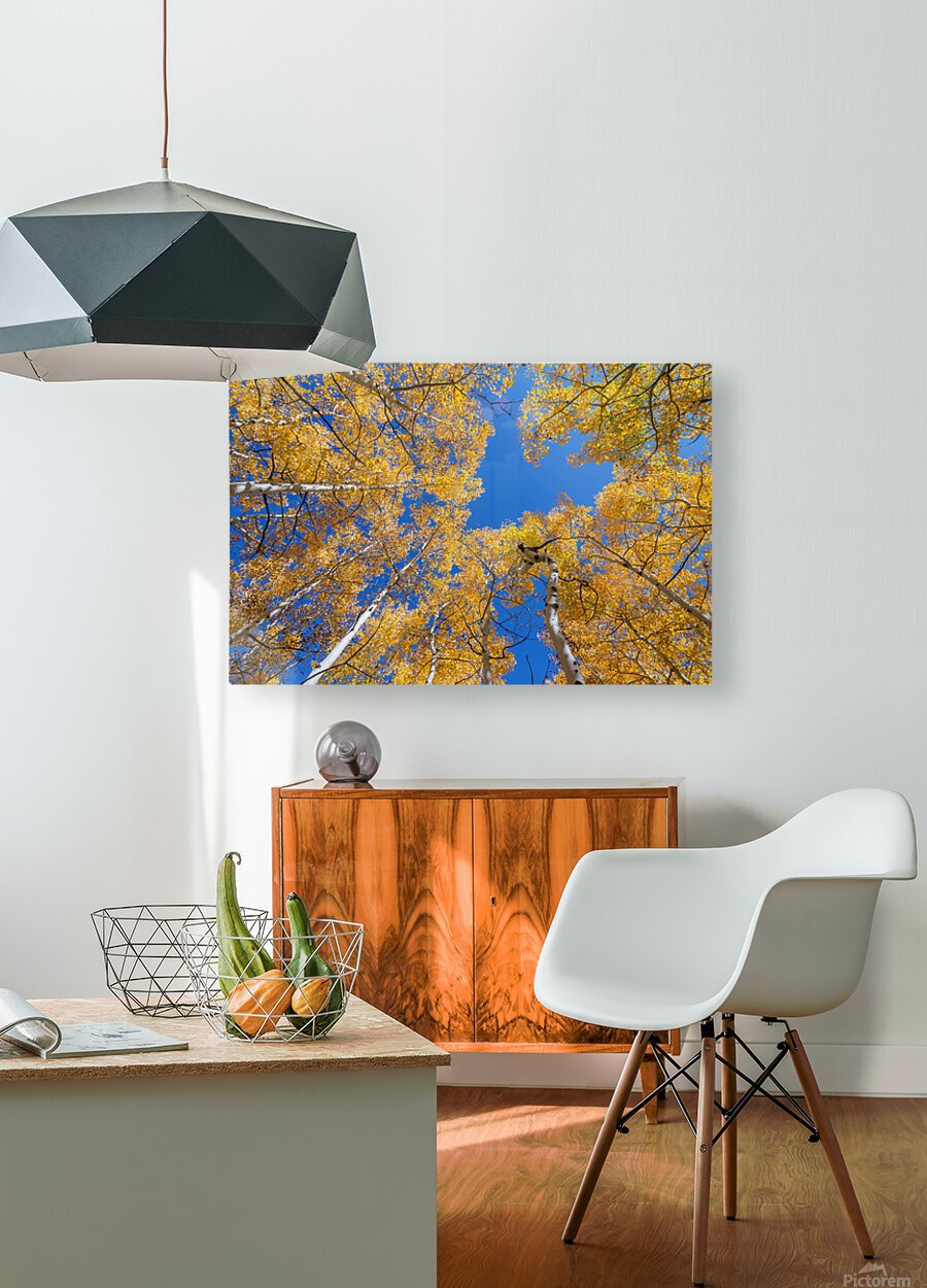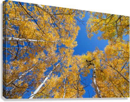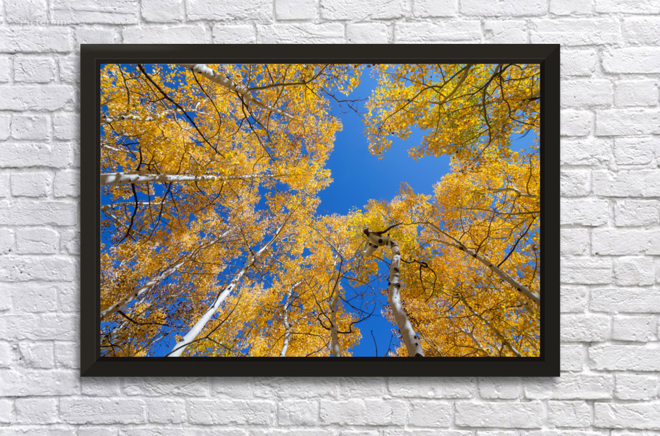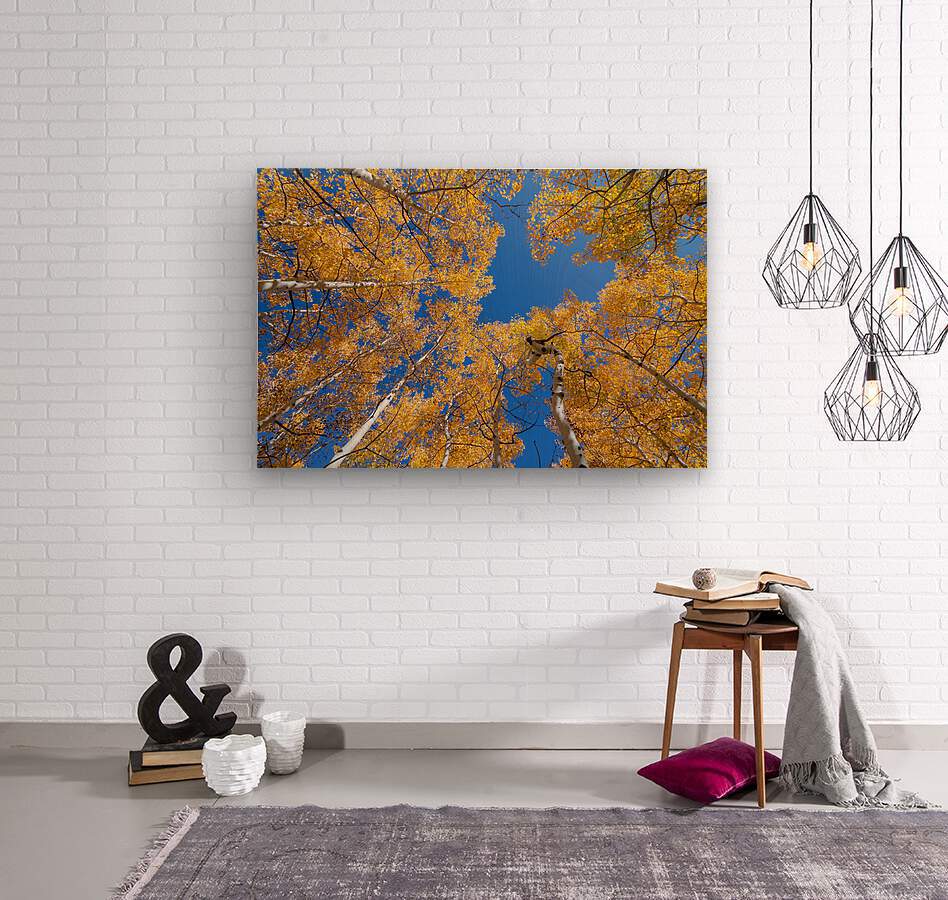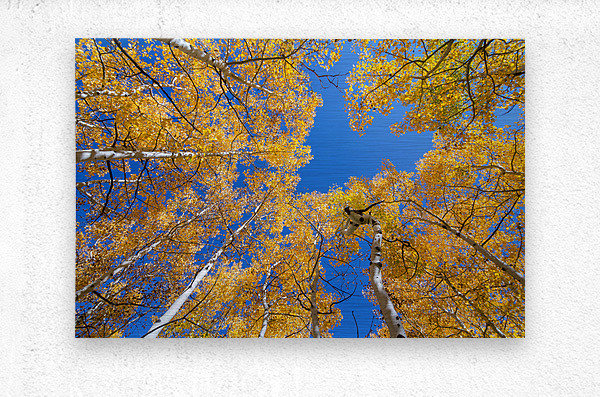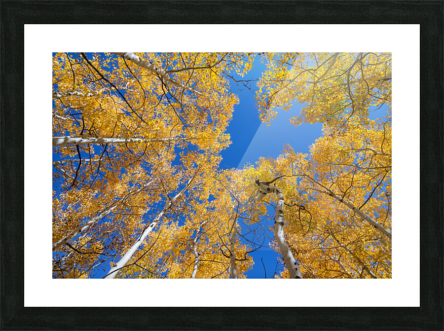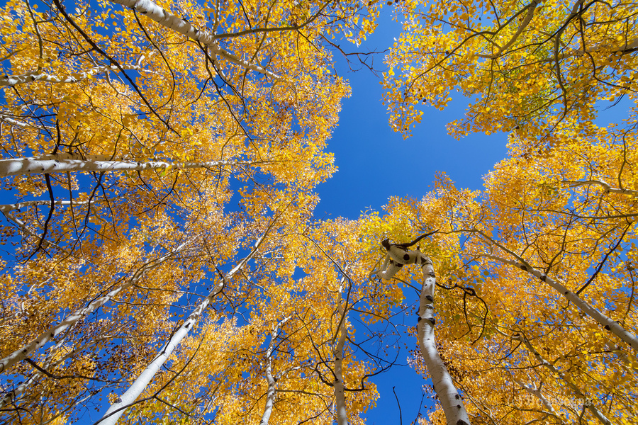 Here is a golden view on a blue sky sunny day with perfect weather upward to the sun in an aspen forest. West Boulder County Colorado.