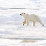 A polar bear is walking on the ice in Svalbard Norway looking for food. Her reflection is showing in a pool of water.