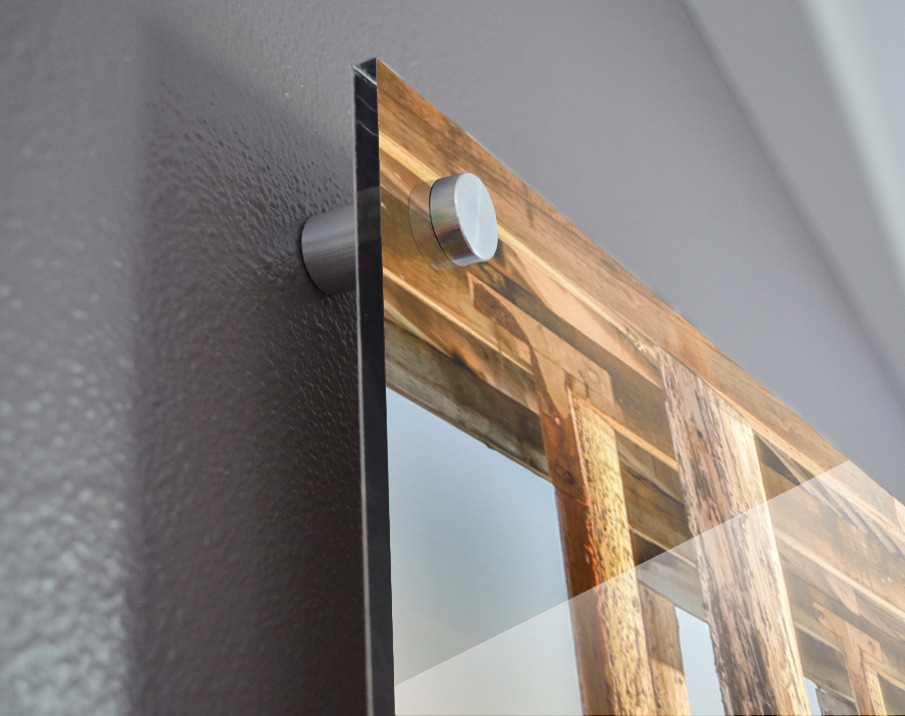 Printed to the edge - Ready to hang - provided with 4 premium polished aluminum stand off ( wall screws and mounting hardware provided )