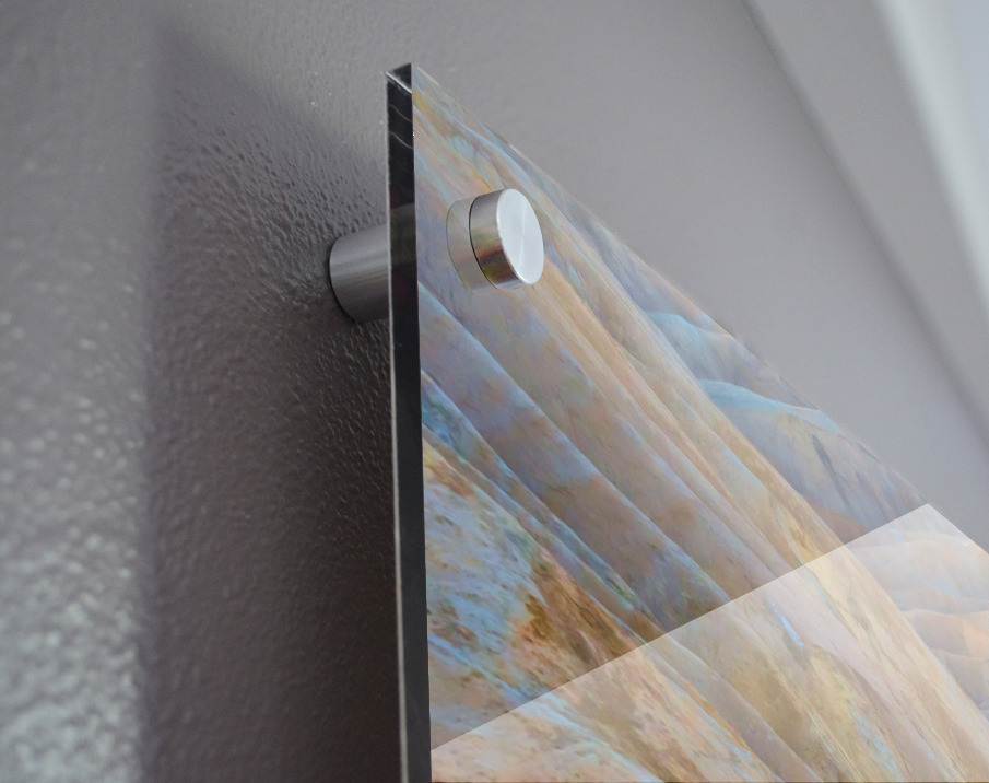 Printed to the edge - Ready to hang - provided with 4 premium polished aluminum stand off ( wall screws and mounting hardware provided )